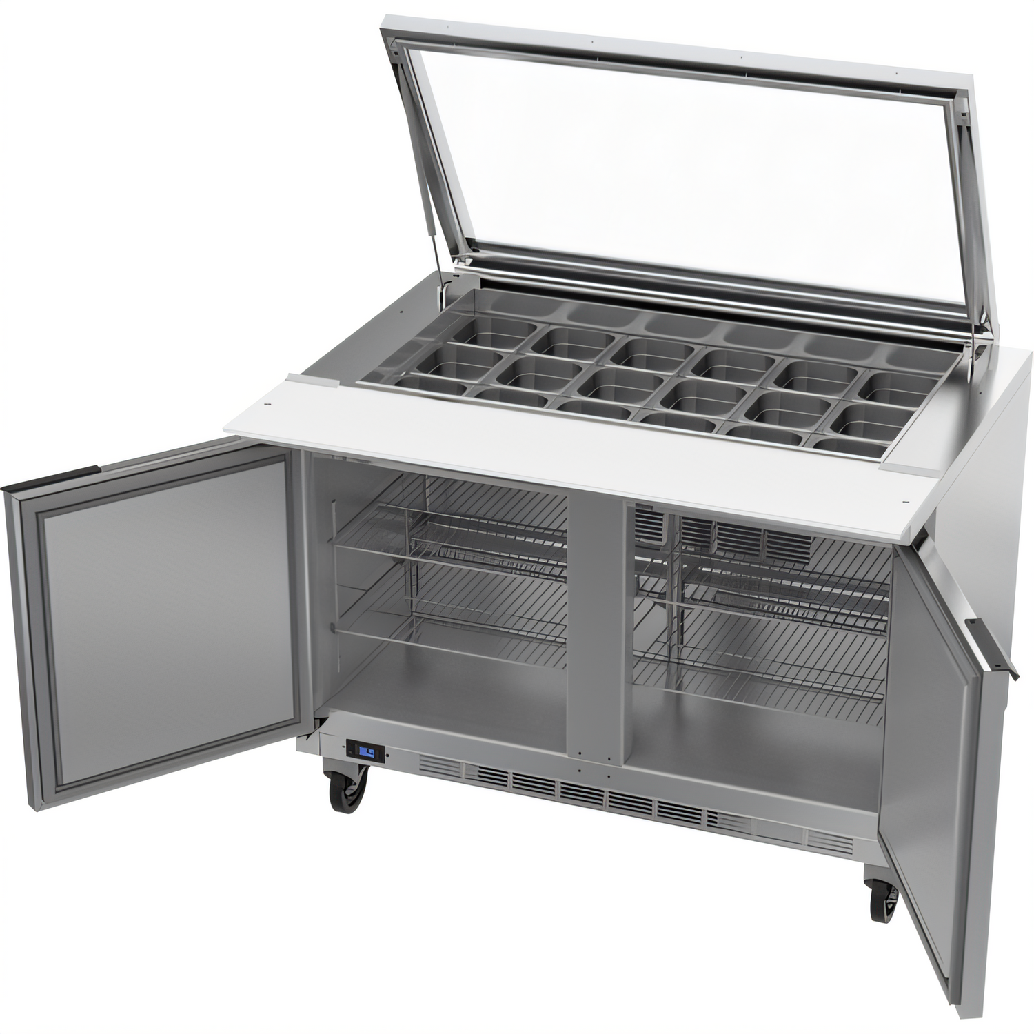 Mega Top Refrigerated Counter, with see thru-lids, two-section, 48"W, 13.01 cu. ft., (2) doors, (4) shelves, stainless steel top with opening for (18) 1/6 size pans, 10" cutting board, stainless steel exterior, aluminum interior, rear-mounted self-contained refrigeration, (pans furnished are 4" deep, tops will accommodate 6" deep pans) R290 Hydrocarbon refrigerant, 1/6 HP, cULus, UL EPH Classified, UL-Sanitation