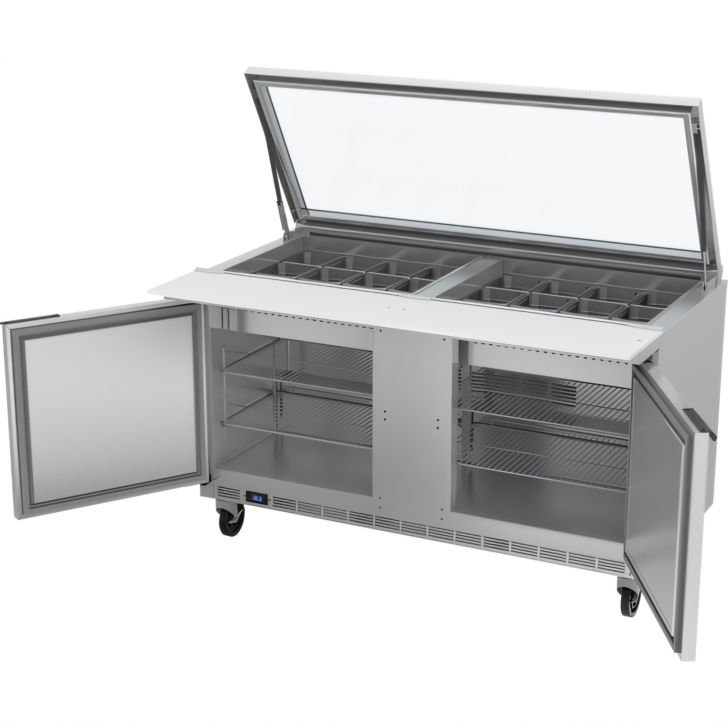 Mega Top Refrigerated Counter, with see-thru lids, two-section, 60"W, 16.02 cu. ft. capacity, (2) doors, (4) shelves, stainless steel top with opening for (24) 1/6 size pans, 10" cutting board, stainless steel exterior top, front, sides & doors, galvanized steel exterior bottom and back, aluminum interior, rear-mounted self-contained refrigeration, (pans furnished are 4" deep, tops will accommodate 6" deep pans) R290 Hydrocarbon refrigerant, 1/3 HP, cULus, UL EPH Classified, UL-Sanitation