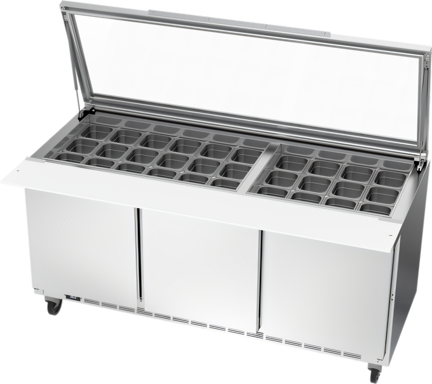Mega Top Refrigerated Counter, with see-thru lid, three-section, 72"W, 20.02 cu. ft. capacity, (3) doors, stainless steel top with opening for (30) 1/6 size pans, 10" cutting board, (6) shelves, stainless steel exterior top, front, sides & doors, galvanized steel exterior bottom and back, aluminum interior, rear-mounted self-contained refrigeration, (pans furnished are 4" deep, tops will accommodate 6" deep pans) R290 Hydrocarbon refrigerant, 1/3 HP, cULus, UL EPH Classified, UL-Sanitation