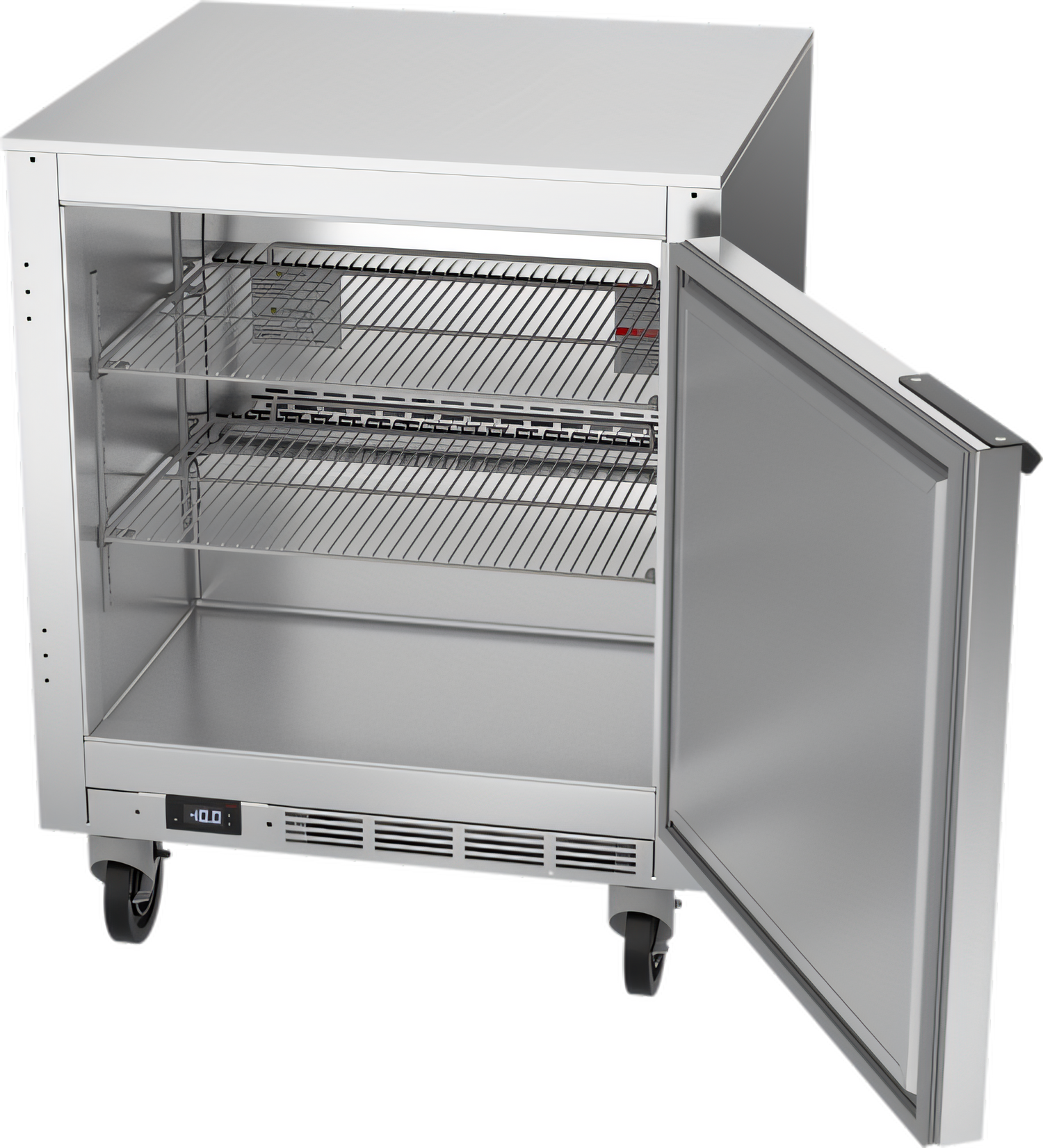 Undercounter Freezer, one-section, 27"W, 5.24 cu. ft. capacity, shallow depth, (1) solid hinged door, (2) shelves, stainless steel top with turned down edges, stainless steel exterior top, front, sides, doors & grille, galvanized steel exterior bottom and back, aluminum interior, rear-mounted self-contained refrigeration, R290 Hydrocarbon refrigerant, 1/4 HP, cULus, UL EPH Classified, UL-Sanitation