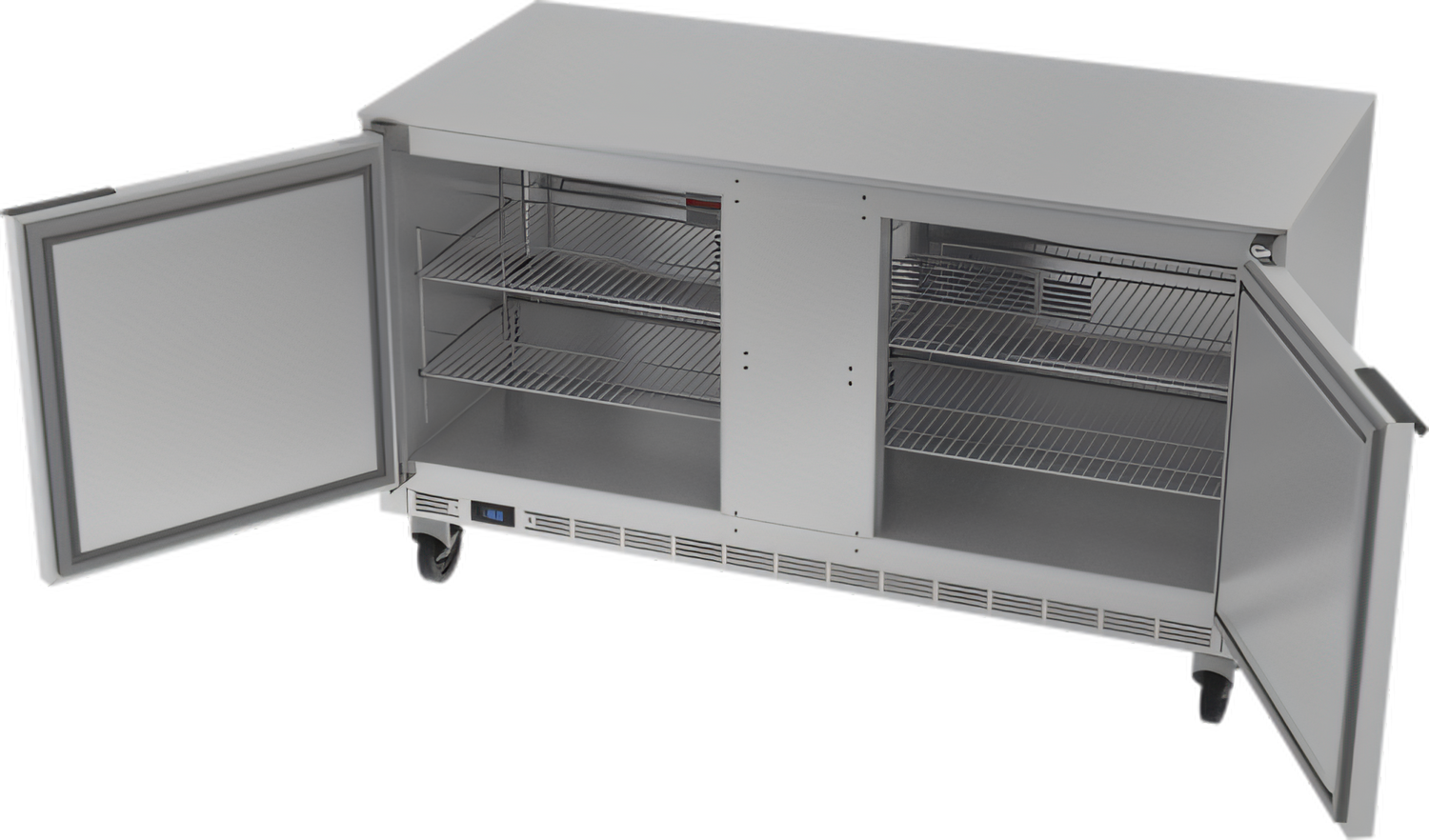 Undercounter Freezer, two-section, 60"W, 14.39 cu. ft., (2) doors, (4) shelves, stainless steel top with turned down edges, stainless steel exterior top, front, sides, doors & grille, aluminum interior, rear-mounted self-contained refrigeration, R290 Hydrocarbon refrigerant, 1/2 HP, cULus, UL EPH Classified, UL-Sanitation