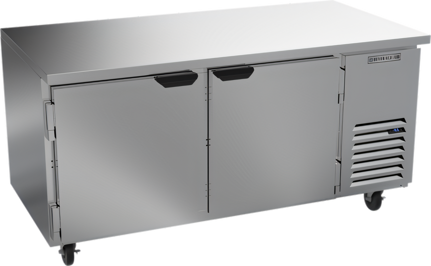 Undercounter Side-Mount Freezer, two-section, 67"W, 20.08 cu. ft., electronic control, (2) hinged self-closing solid doors, (4) wire shelves, stainless steel exterior top, front, sides, doors & grille, aluminum interior, galvanized back & bottom, side-mounted self-contained refrigeration, R290 Hydrocarbon refrigerant, 3/4 HP, cULus, UL EPH Classified, UL-Sanitation