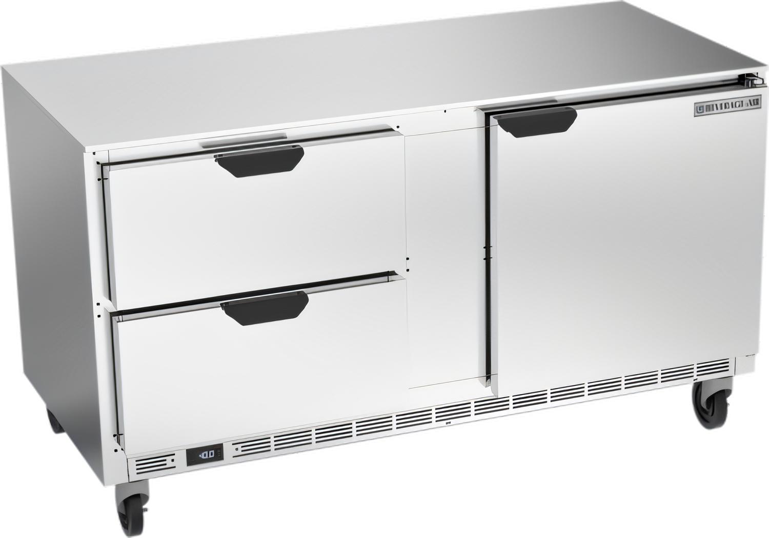 Undercounter Freezer, two-section, 60"W, 17.1 cu. ft., (2) drawers (1) door, (2) shelves, stainless steel exterior & top, aluminum interior, rear-mounted self-contained refrigeration, R290 Hydrocarbon refrigerant, 1/2 HP, cULus, UL EPH Classified, UL-Sanitation