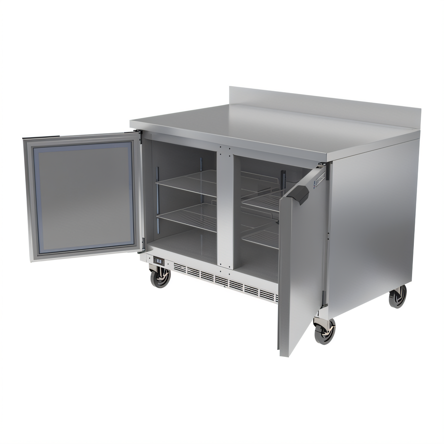 Worktop Freezer, two-section, 48"W, 11.04 cu. ft., (2) solid doors, (4) shelves, snap-in door gaskets, stainless stainless steel exterior top, front, sides, door & grille, galvanized steel exterior back & bottom, aluminum interior, 4" removable backsplash, rear-mounted self-contained refrigeration, R290 Hydrocarbon refrigerant, 1/2 HP, cULus, UL EPH Classified, UL-Sanitation