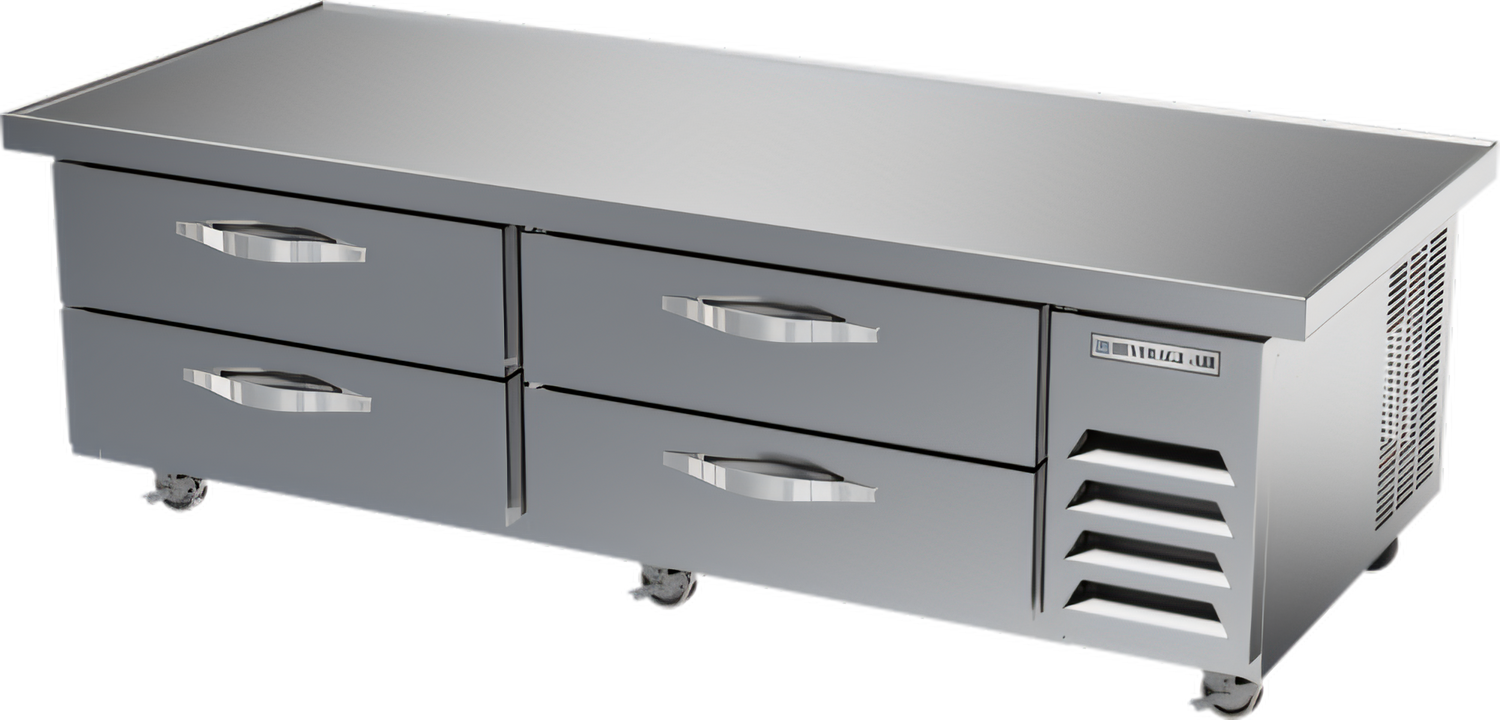 Worktop Cook Stand Freezer, two-section, 76"W, 14.51 cu. ft., (4) drawers, top drawer holds (2) 12" x 20" x 6" pans per drawer & bottom drawer holds (2) 12" x 20" x 6" pans per drawer (NOT included), digital display, fire-proof stainless steel top, front & sides (no heat shield required), full marine drip guard, aluminum interior, expans per drawerion valve technology, self-contained refrigeration, R290 Hydrocarbon refrigerant, 3/4 HP, cULus, UL EPH Classified, UL-Sanitation