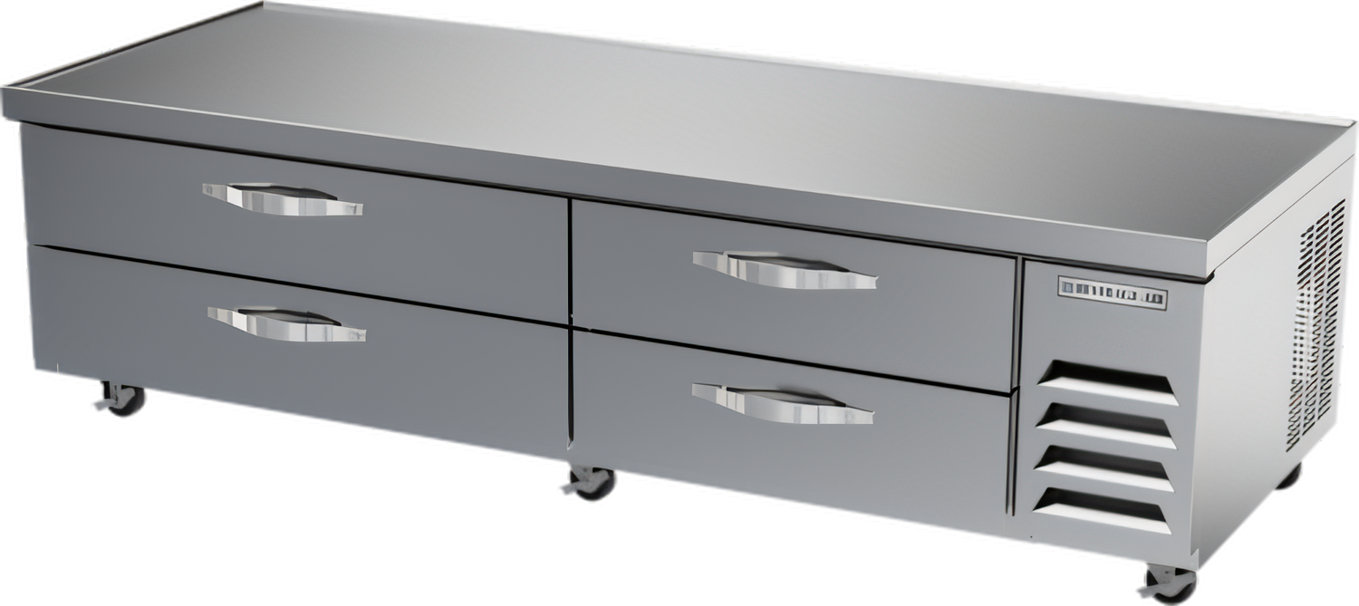Worktop Cook Stand Freezer, two-section, 84"W, 17.46 cu. ft., (4) drawers, top drawer holds (3) left & (2) right) 12" x 20" x 6" pans per drawer & bottom drawer holds (3) left & (2) right) 12" x 20" x 6" pans per drawer (NOT included), digital display, fire-proof stainless steel top, front & sides (no heat shield required), full marine drip guard, aluminum interior, expans per drawerion valve technology, self-contained refrigeration, R290 Hydrocarbon refrigerant, 3/4 HP, cULus, UL EPH Classified, UL-Sanitation