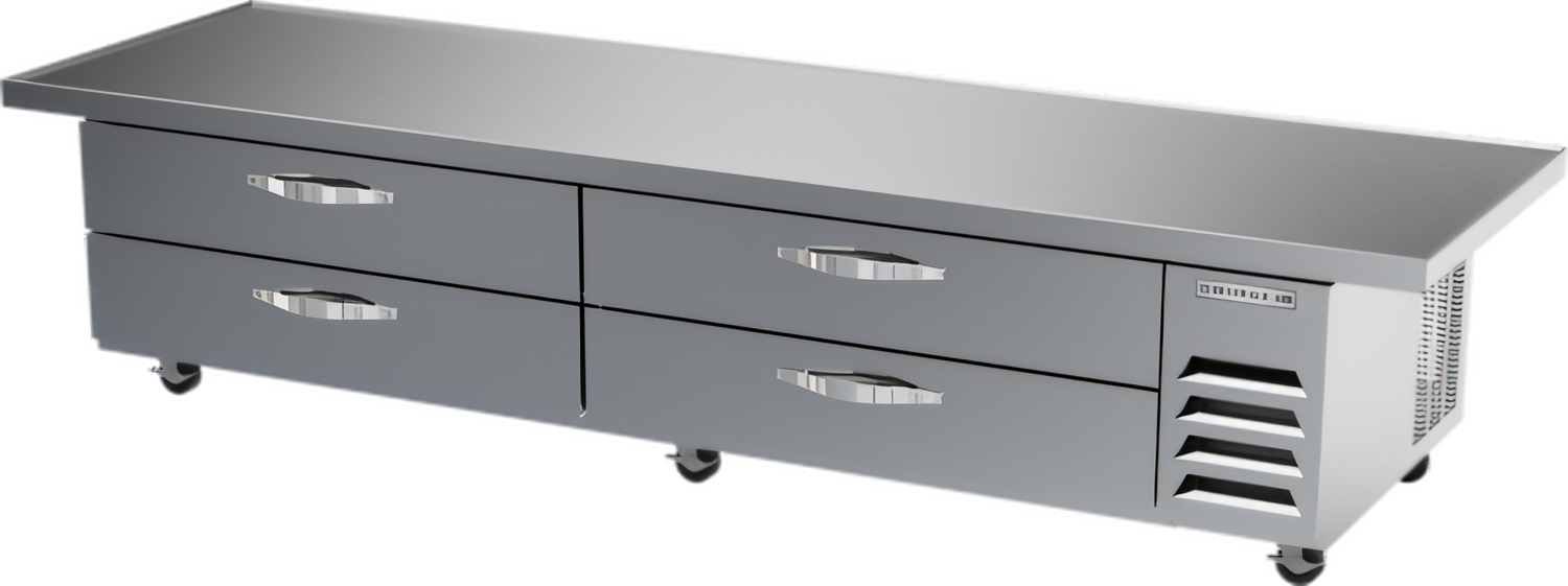 Worktop Cook Stand Freezer, two-section, 108"W, 20.42 cu. ft., (4) drawers, top drawers each hold (3) 12" x 20" x 6" pans per drawer & bottom drawers each hold (3) 12" x 20" x 6" pans per drawer (NOT included), digital display, fire-proof stainless steel top, front & sides (no heat shield required), full marine drip guard, aluminum interior, self-contained refrigeration, R290 Hydrocarbon refrigerant, 3/4 HP, cULus, UL EPH Classified, UL-Sanitation