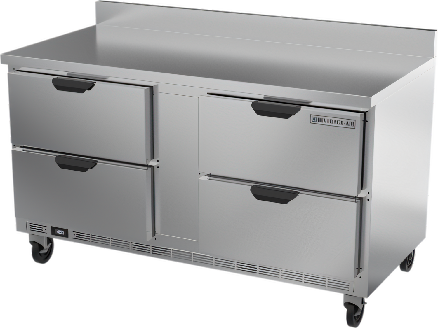 Worktop Freezer, two-section, 60"W, 14.39 cu. ft., (4) drawers, stainless steel front, 2-1/2" thick top & sides, aluminum interior, 4" foamed-in place backsplash, rear-mounted self-contained refrigeration, R290 Hydrocarbon refrigerant, 1/2 HP, cULus, UL EPH Classified, UL-Sanitation