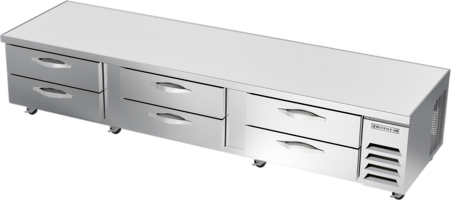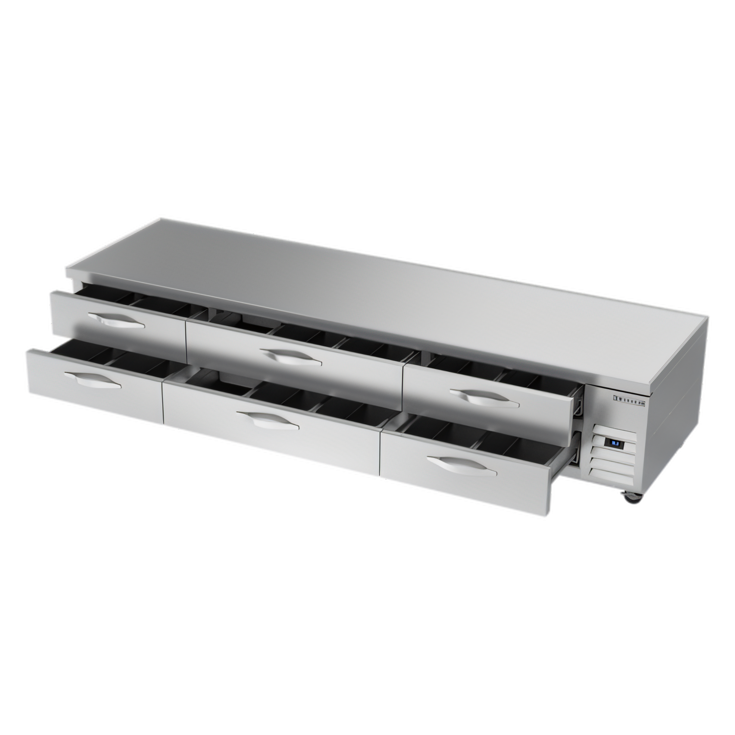 Worktop Cook Stand Refrigerator, three-section, 112"W, 24.36 cu. ft., (6) drawers, holds (2) pans per drawer, ( NOT included), fire-proof stainless steel top, front & sides (no heat shield required), full marine drip guard, aluminum interior, side-mounted self-contained refrigeration, R290 Hydrocarbon refrigerant, 1/3 HP, cULus, UL EPH Classified, UL-Sanitation