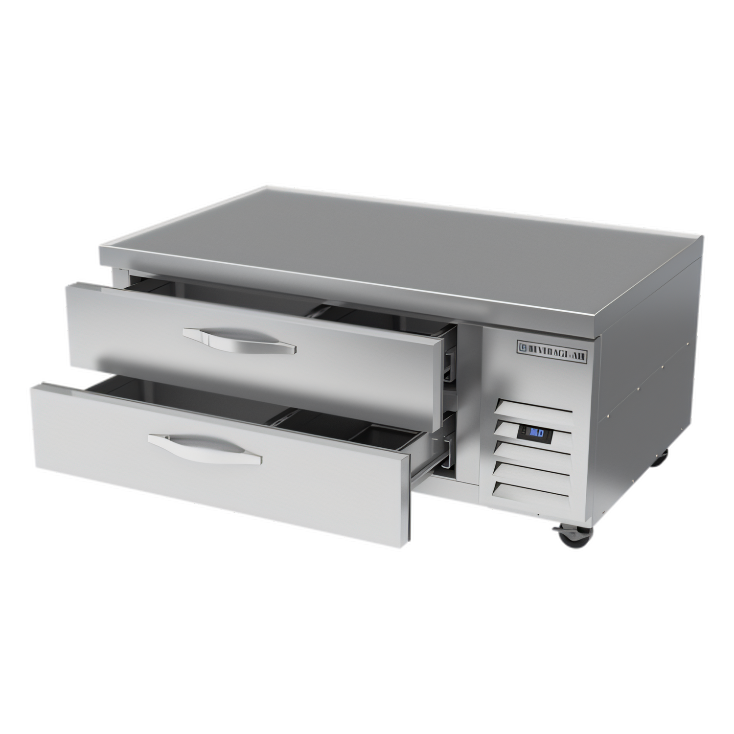 Worktop Cook Stand Refrigerator, one-section, 52"W, 9.58 cu. ft., (2) drawers, holds (2) pans per drawer, ( NOT included), fire-proof stainless steel top, front & sides (no heat shield required), full marine drip guard, aluminum interior, side-mounted self-contained refrigeration, R290 Hydrocarbon refrigerant, 1/6 HP, cULus, UL EPH Classified, UL-Sanitation