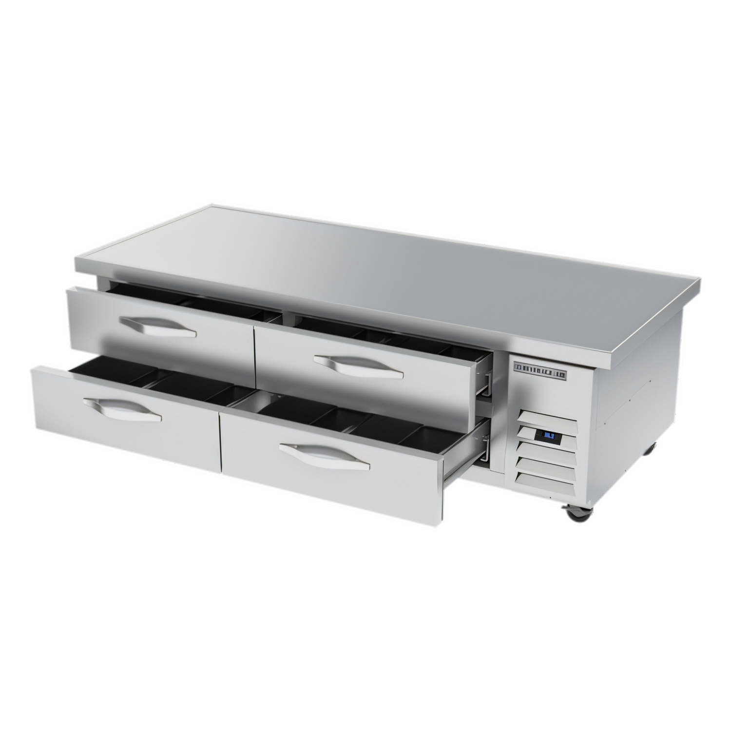 Worktop Cook Stand Refrigerator, two-section, 76"W, 14.51 cu. ft., (4) drawers, top drawer holds (2) 12" x 20" x 6" pans per drawer & bottom drawer holds (2) 12" x 20" x 6" pans per drawer (NOT included), fire-proof stainless steel top, front & sides (no heat shield required), full marine drip guard, aluminum interior, side-mounted self-contained refrigeration, R290 Hydrocarbon refrigerant, 1/3 HP, cULus, UL EPH Classified, UL-Sanitation