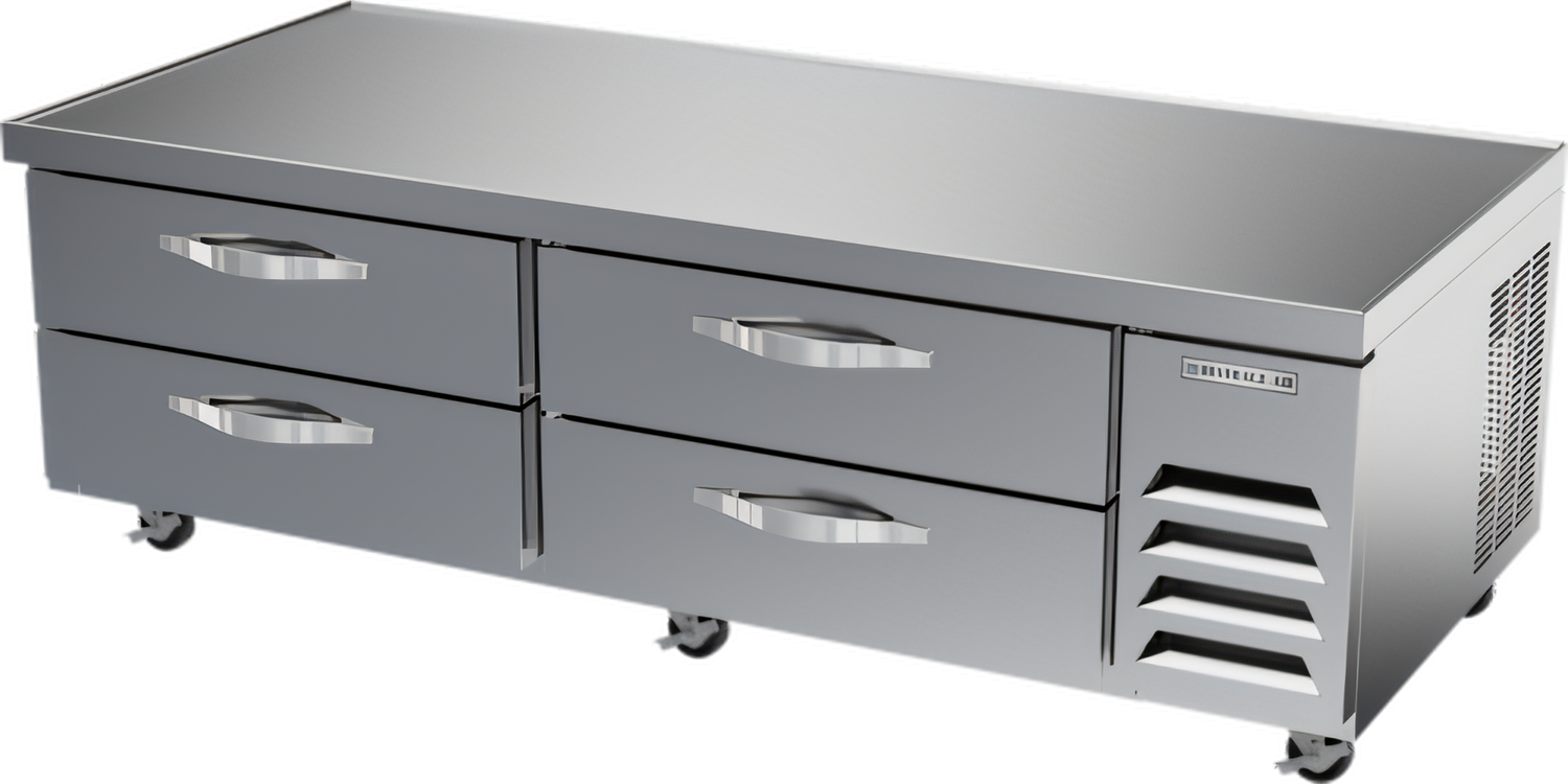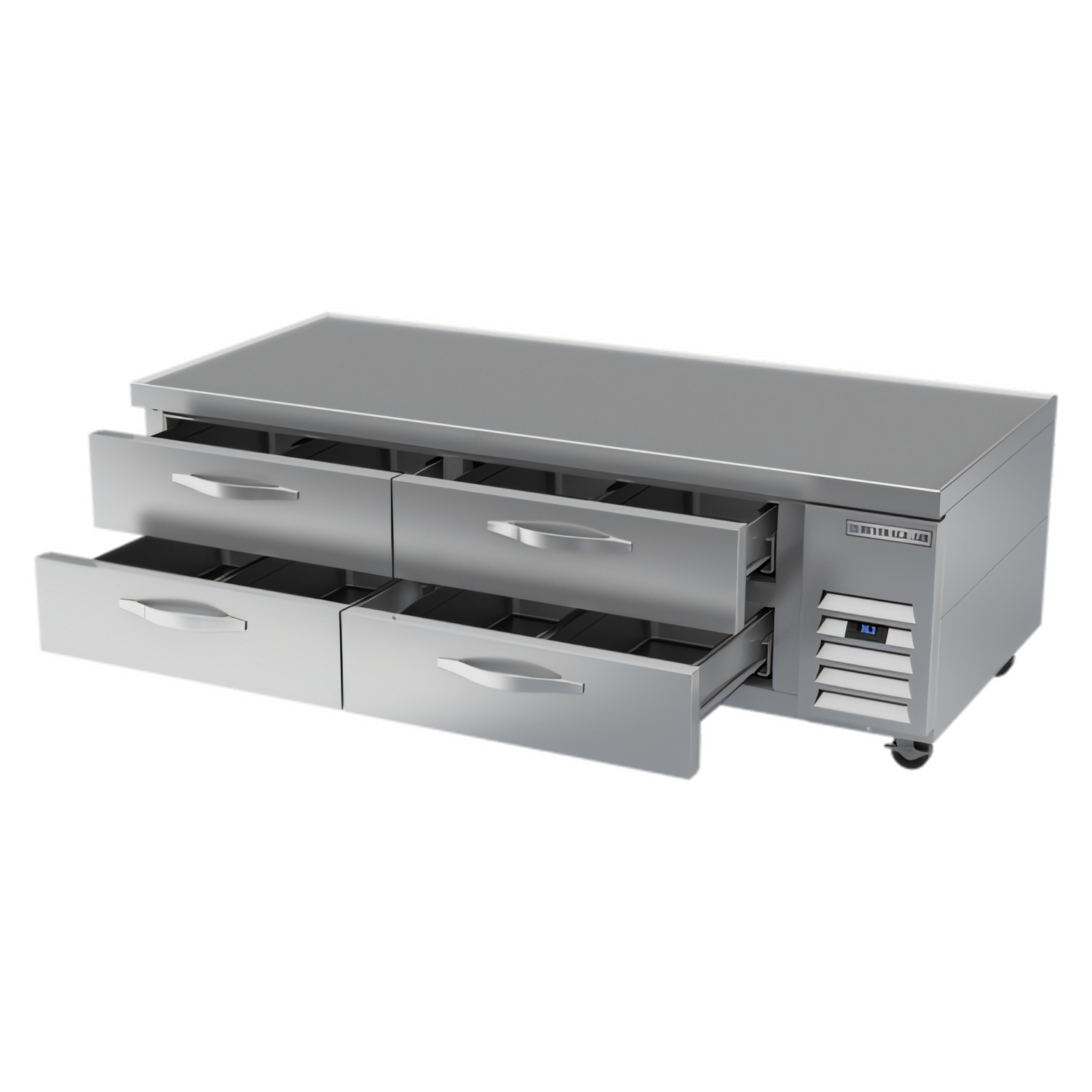 Worktop Cook Stand Refrigerator, two-section, 72"W, 14.51 cu. ft., (4) drawers, top drawer holds (2) 12" x 20" x 6" pans per drawer & bottom drawer holds (2) 12" x 20" x 6" pans per drawer (NOT included), fire-proof stainless steel top, front & sides (no heat shield required), full marine drip guard, aluminum interior, side-mounted self-contained refrigeration, R290 Hydrocarbon refrigerant, 1/3 HP, cULus, UL EPH Classified, UL-Sanitation
