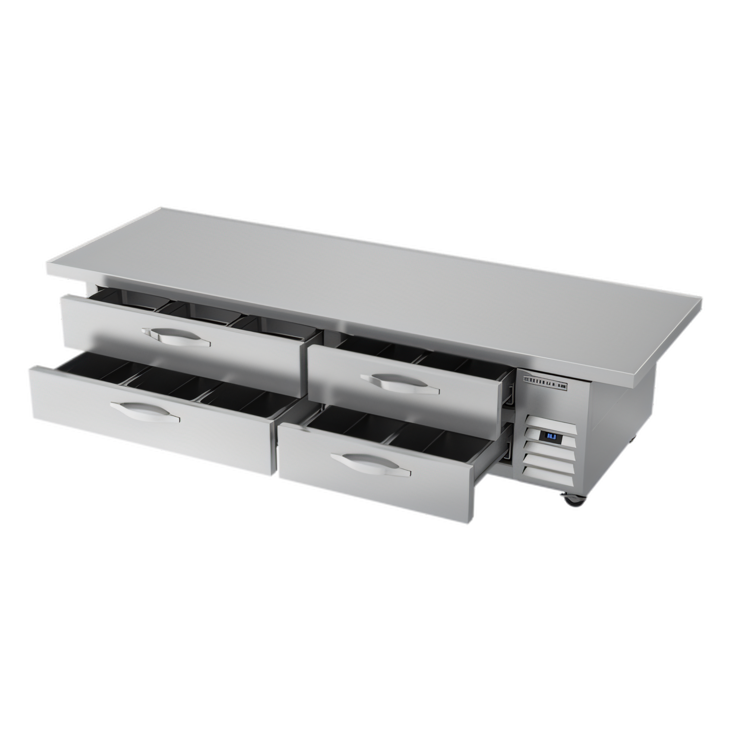 Worktop Cook Stand Refrigerator, two-section, 96"W, 17.46 cu. ft., (4) drawers, top drawer holds (3) left & (2) right) 12" x 20" x 6" pans per drawer & bottom drawer holds (3) left & (2) right) 12" x 20" x 6" pans per drawer (NOT included), fire-proof stainless steel top, front & sides (no heat shield required), full marine drip guard, aluminum interior, side-mounted self-contained refrigeration, R290 Hydrocarbon refrigerant, 1/3 HP, cULus, UL EPH Classified, UL-Sanitation