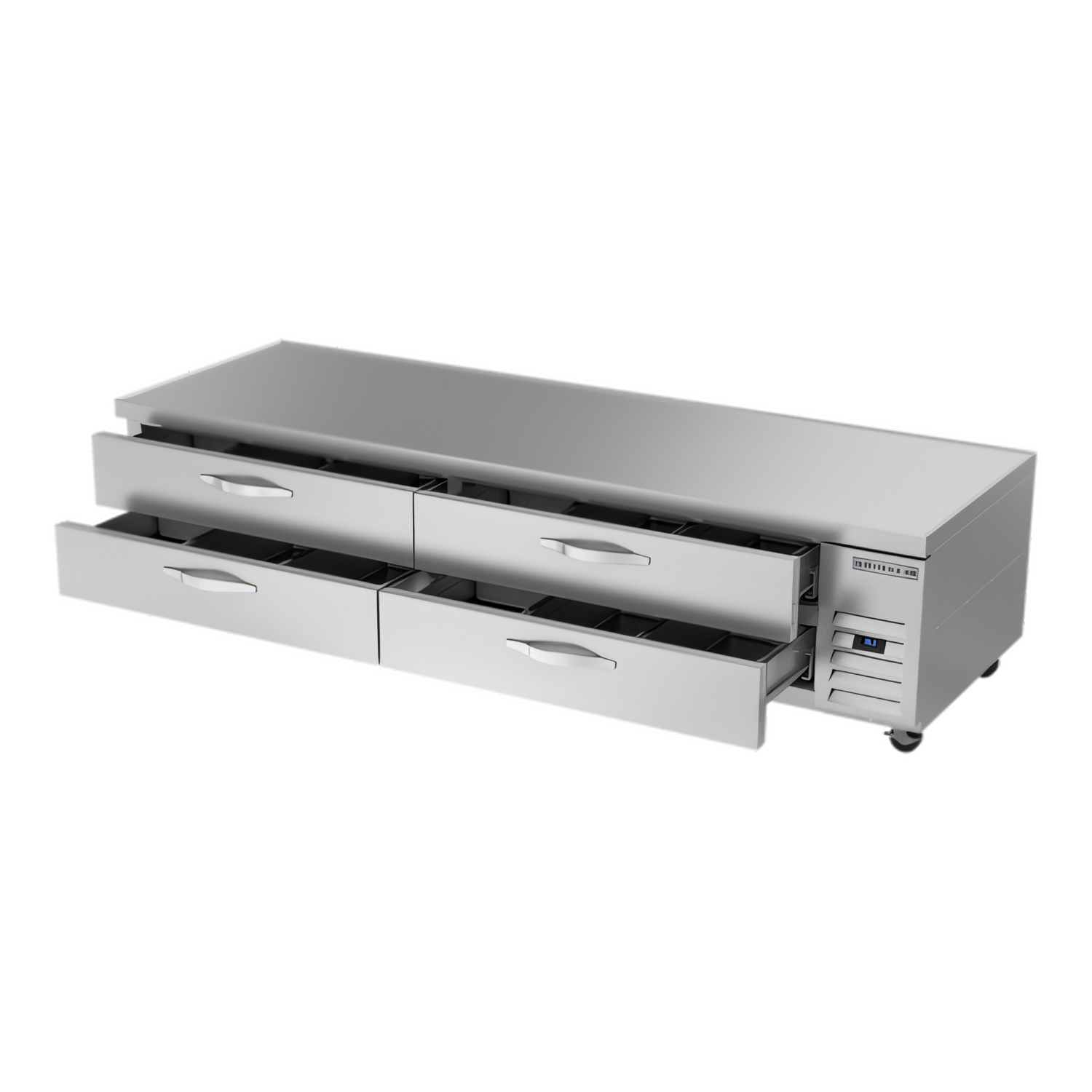 Worktop Cook Stand Refrigerator, two-section, 96"W, 20.42 cu. ft., (4) drawers, top drawers each hold (3) 12" x 20" x 6" pans per drawer & bottom drawers each hold (3) 12" x 20" x 6" pans per drawer (NOT included), fire-proof stainless steel top, front & sides (no heat shield required), full marine drip guard, aluminum interior, side-mounted self-contained refrigeration, R290 Hydrocarbon refrigerant, 1/3 HP, cULus, UL EPH Classified, UL-Sanitation
