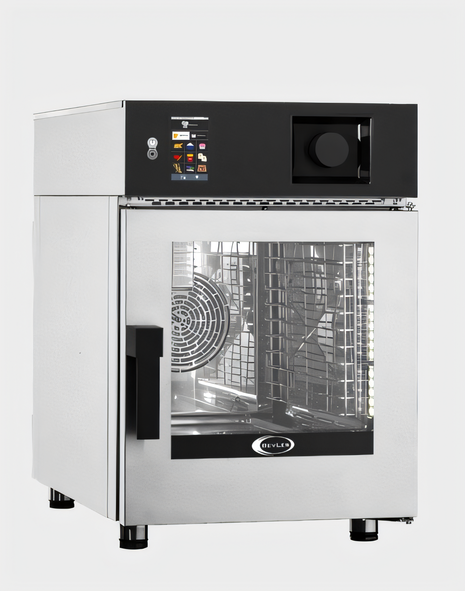 BevLes Model BMCE06LHWSServe perfectly cooked food on a compact footprint. The BevLes Minitouch combines dry heat, steam, or any mix of the two without a costly boiler system, giving you the versatility of a full-size combi in a 21"-wide countertop unit that still holds six 13" × 18" half-size sheet pans or six 1/1 GN pans. A 5" color touchscreen and three intelligent “assistants” make everything from programming to cleaning radically simple.
