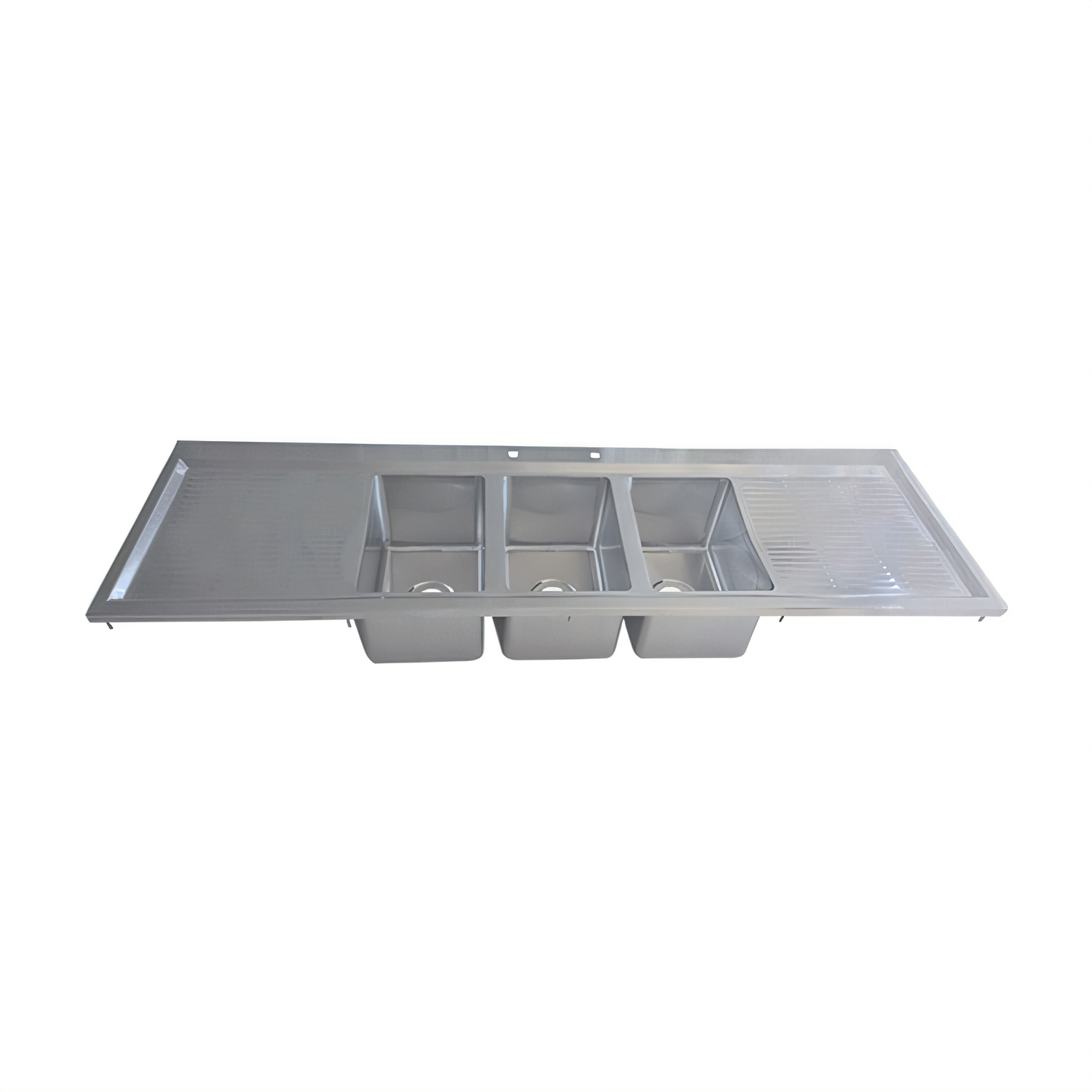 Drop-In Sink, three compartment, 70-1/8"W x 20"D x 10-5/8"H overall size, (3) 10" wide x 14" front-to-back x 10" deep compartments, 18" drainboards on left & right, marine edge, includes (1) deck mount faucet (BK8D-8G-G) & (3) basket drains (BKDR-4), 18/304 stainless steel construction, 69-3/8" x 19-1/2" cutout required, lead free, NSF