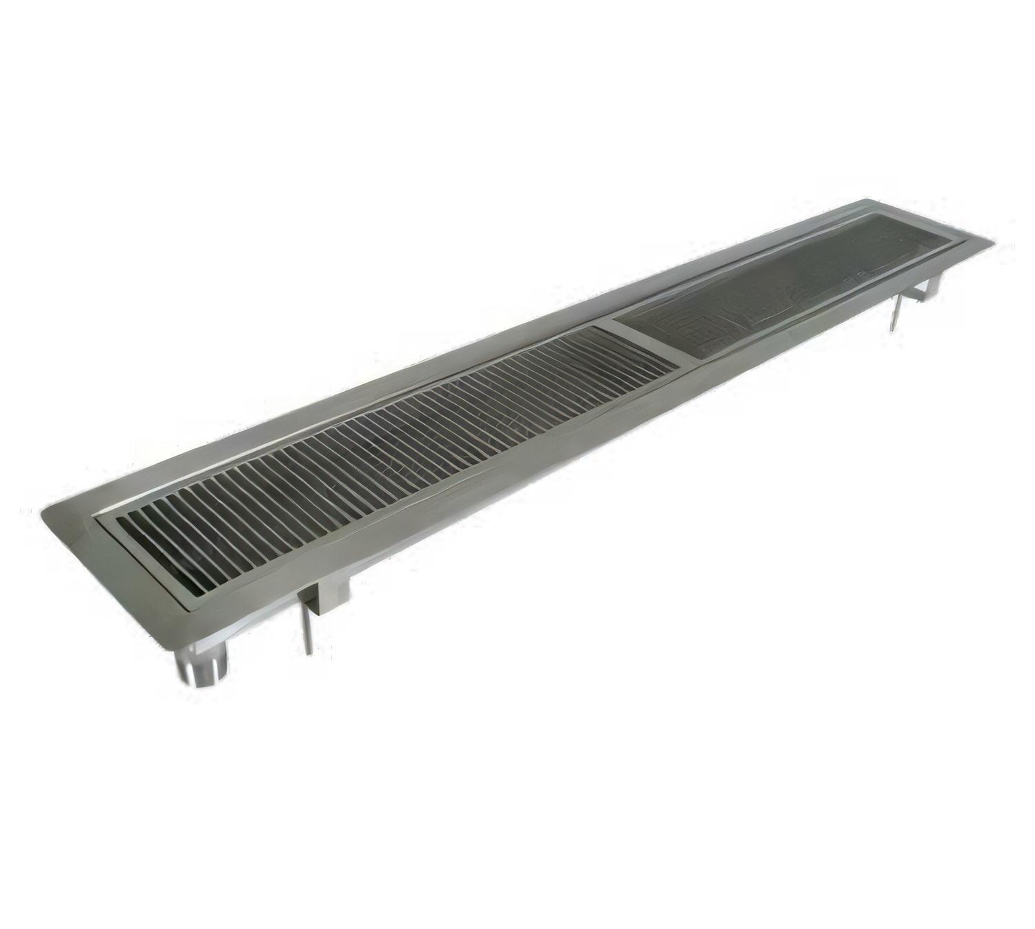 Urn Trough with Drip Plate, 36"L, 7/8" deep tray, removable, 1" flush mount & 1/4" rounded corners trim plate, 1-1/4 " OD drain, 14/304 stainless steel, mounting hardware included