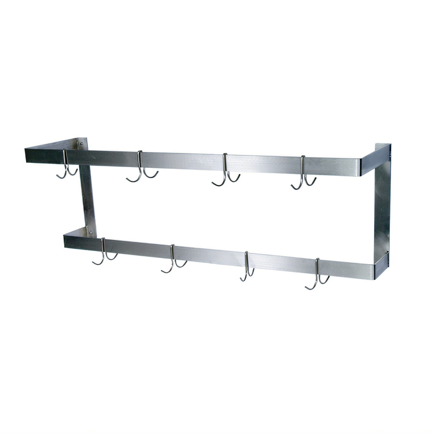 Pot Rack, wall mount, double bar, 72"W x 12"D, 304 stainless steel, 2" flat bar, 12"D top bar, 6"D bottom bar, (12) stainless steel double prong hooks (BKSSDPH), NSF