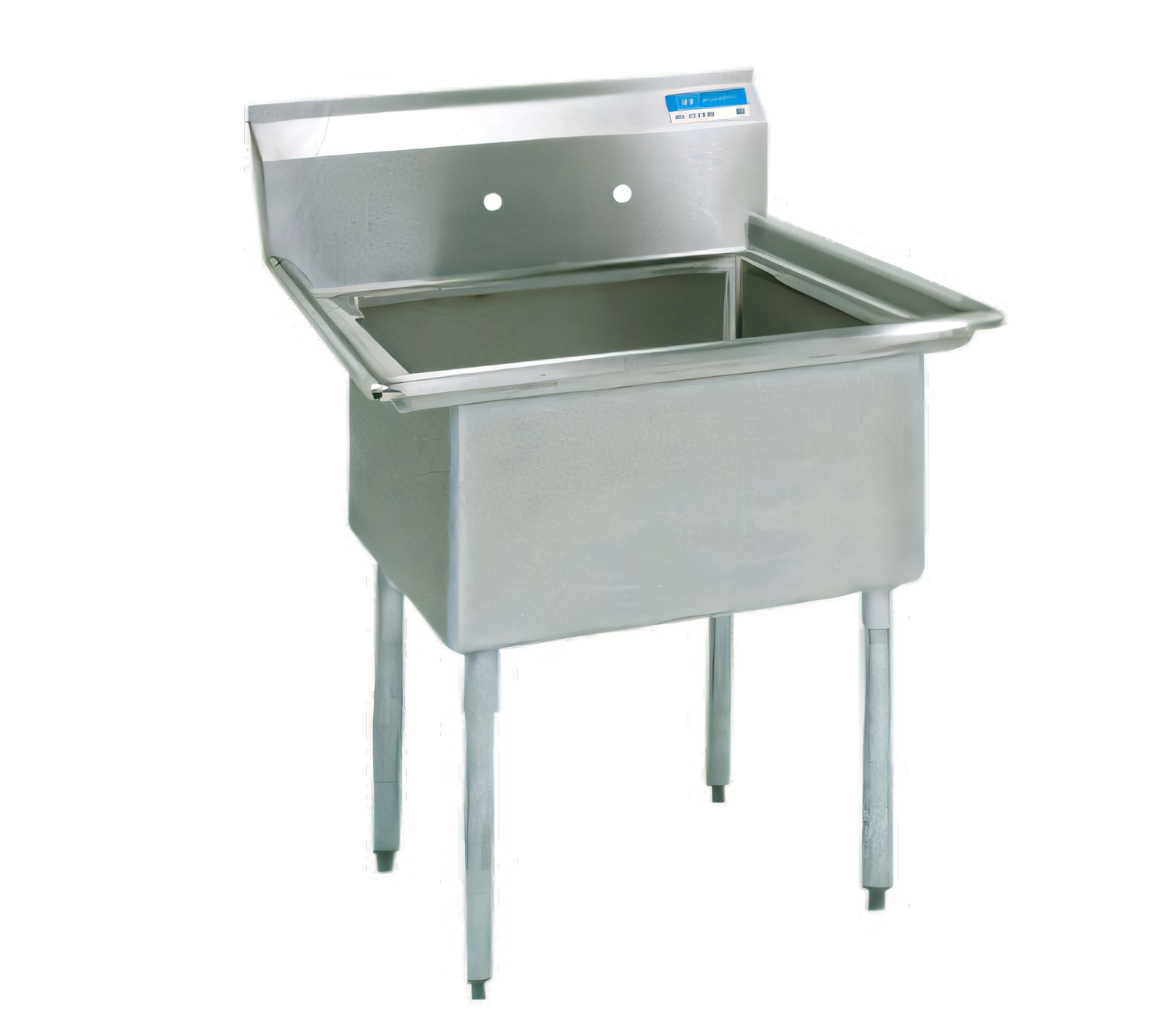 Sink, one compartment, 23"W x 29-13/16"D x 43-3/4"H overall size, 18" wide x 24" front-to-back x 14" deep compartment, 9"H backsplash, 8" OC splash mount faucet holes, 1-1/2" rolled edges on front & sides, 18/304 stainless steel deck & bowl, galvanized steel legs, adjustable high impact corrosion resistant feet, NSF