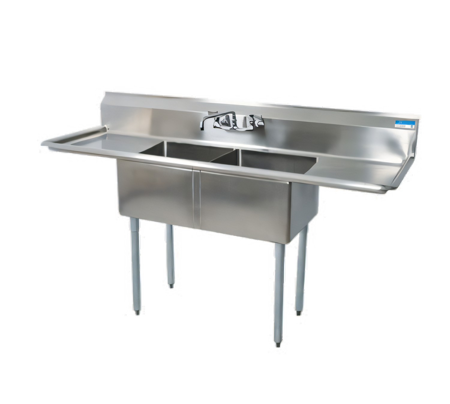 Sink, two compartment, 68"W x 25-13/16"D x 43-3/4"H overall size, 16" wide x 20" front-to-back x 12" deep compartments, (2) left & right 18" drainboards, 9"H backsplash, 8" OC splash mount faucet holes, 1-1/2" rolled edges on front & sides, includes basket drains (BKDR-4), 18/304 stainless steel construction, galvanized steel legs, adjustable high impact corrosion resistant feet, NSF