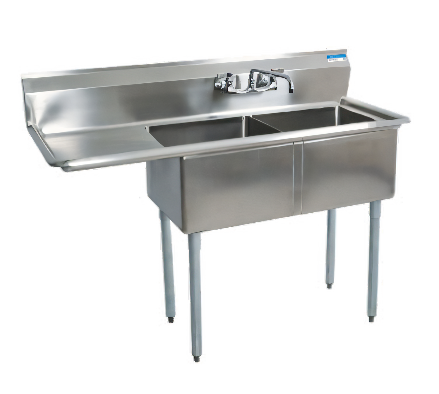 Sink, two compartment, 56-1/2"W x 23-13/16"D x 43-3/4"H overall size, 18” wide x 18” front-to-back x 12" deep compartments, 18" drainboard on left, 9"H backsplash, 8" OC splash mount faucet holes, 1-1/2" rolled edges on front & sides, includes basket drains (BKDR-4), 18/304 stainless steel construction, galvanized steel legs, adjustable high impact corrosion resistant feet, NSF