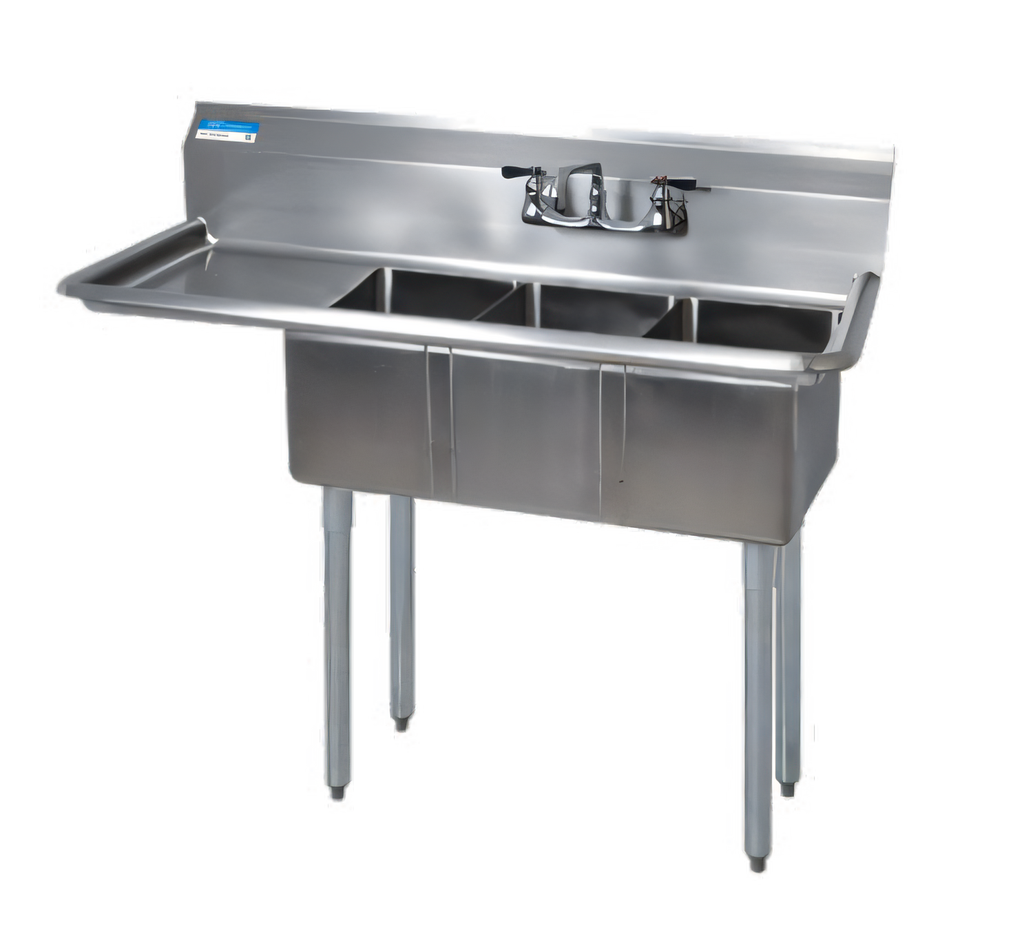 Convenience Store Sink, three compartment, 47-1/2"W x 19-13/16"D x 39-3/4"H overall size, 10" wide x 14" front-to-back x 10" deep compartments, 15" drainboard on left, 9"H backsplash, 8" OC splash mount faucet holes, 1-1/2" rolled edges on front & sides, includes basket drains, 18/304 stainless steel deck & bowl, galvanized steel legs, adjustable high impact corrosion resistant feet, NSF