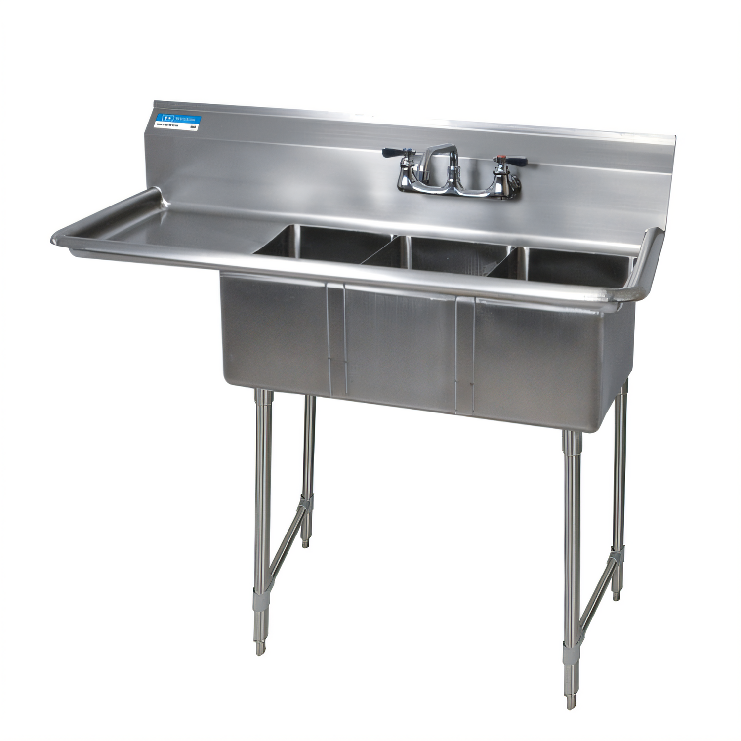 Convenience Store Sink, three compartment, 47-1/2"W x 19-13/16"D x 39-3/4"H overall size, 10" wide x 14" front-to-back x 10" deep compartments, 15" drainboard on left, 9"H backsplash, 8" OC splash mount faucet holes, 1-1/2" rolled edges on front & sides, includes basket drains, 18/304 stainless steel deck & bowl, stainless steel legs & side crossbracing, stainless steel over plastic adjustable bullet feet, NSF