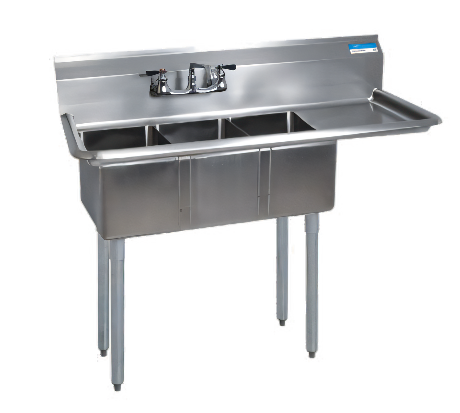 Convenience Store Sink, three compartment, 47-1/2"W x 19-13/16"D x 39-3/4"H overall size, 10" wide x 14" front-to-back x 10" deep compartments, 15" drainboard on right, 9"H backsplash, 8" OC splash mount faucet holes, 1-1/2" rolled edges on front & sides, includes basket drains, 18/304 stainless steel deck & bowl, galvanized steel legs, adjustable high impact corrosion resistant feet, NSF