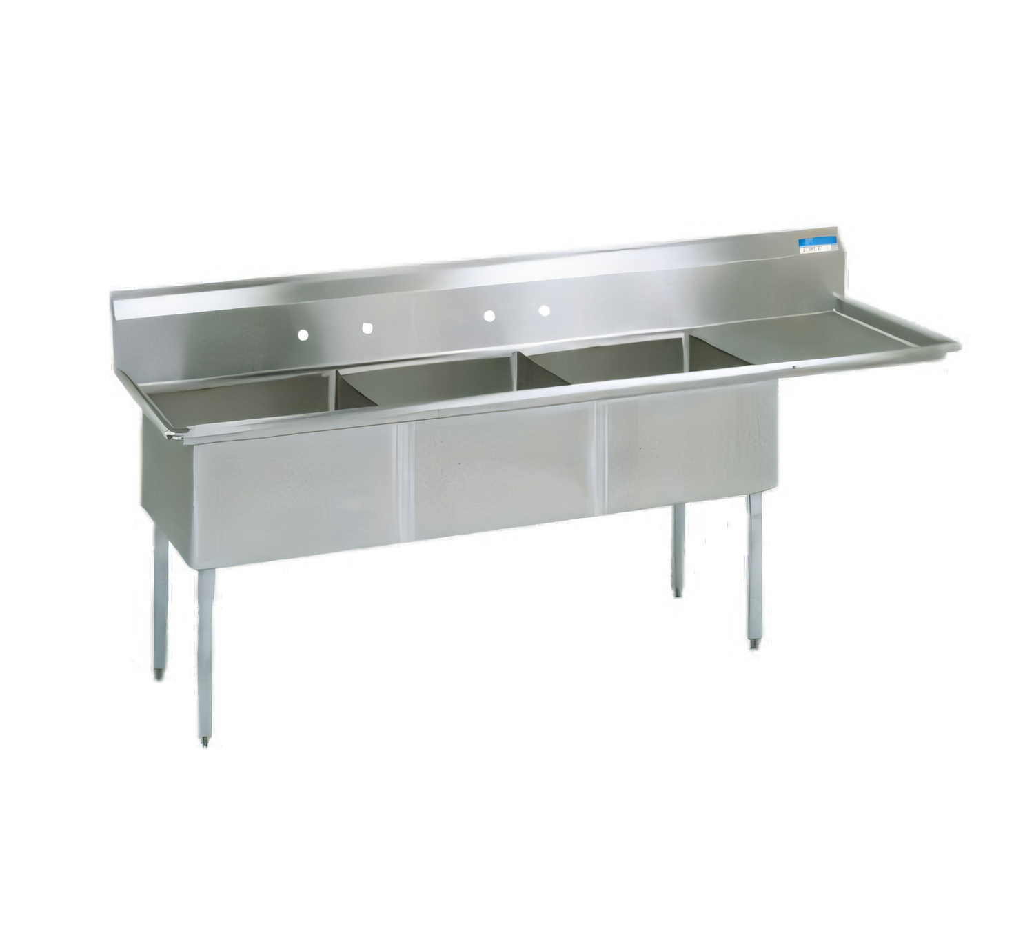 Model BKS-3-24-14-24RS/S legs & bracing • NSF CertifiedEngineered for demanding commercial kitchens, this 98-1/2 inch BK Resources sink delivers a full wash-rinse-sanitize workflow plus a generous 24 inch right-hand drainboard—all in one rugged, NSF-listed unit.
