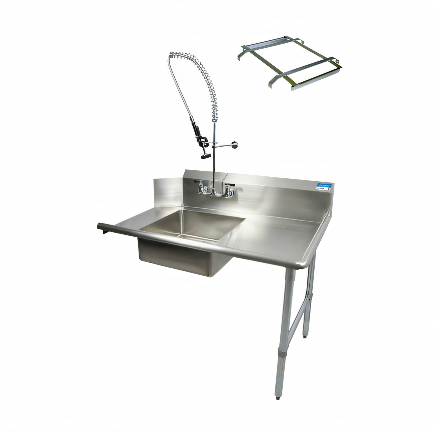 Soiled Dishtable, straight design, 26"W x 30-3/8"D x 46-1/4"H, right-to-left operation, 18/304 stainless steel top, 20" x 20" x 8" deep pre-rinse sink, 8" OC splash mount pre-rinse faucet (BKF-SMPR-WB-G), 10"H backsplash, raised rolled edges on front & sides, (1) rack guide (BK-SDTS), includes basket drain (BKDR-4), galvanized legs & side bracing, high impact corrosion resistant adjustable bullet feet, NSF