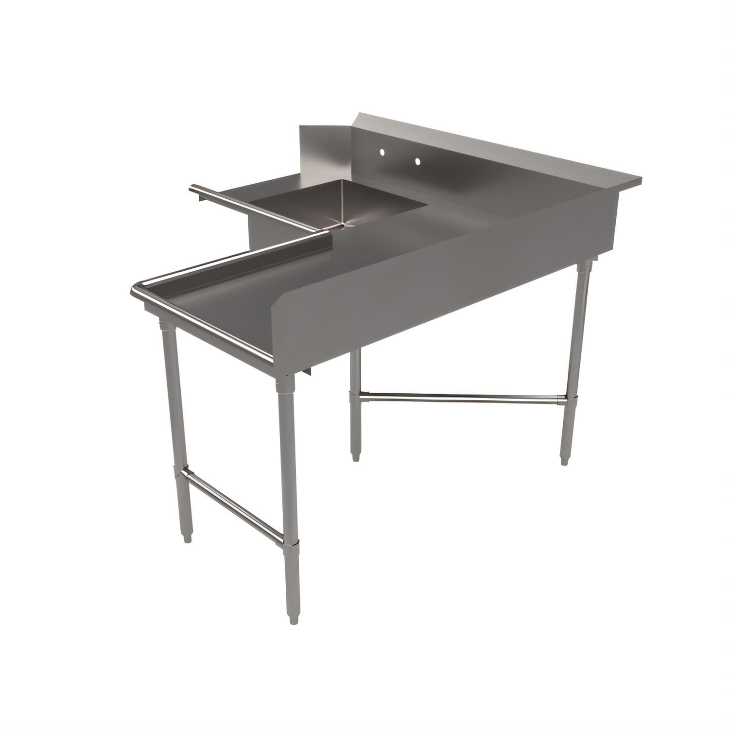 Model BKSDT6-C6096R • 16 ga T-304 Stainless SteelDesigned for high-volume warewashing in tight corner footprints, the BK Resources BKSDT6-C6096R moves racks smoothly from right to left while delivering the rugged durability that only 16-gauge T-304 stainless steel can provide. An integral 20" × 20" × 8" scrap sink, 10" backsplash and reinforced frame help you keep the dish room clean, efficient and up to code.