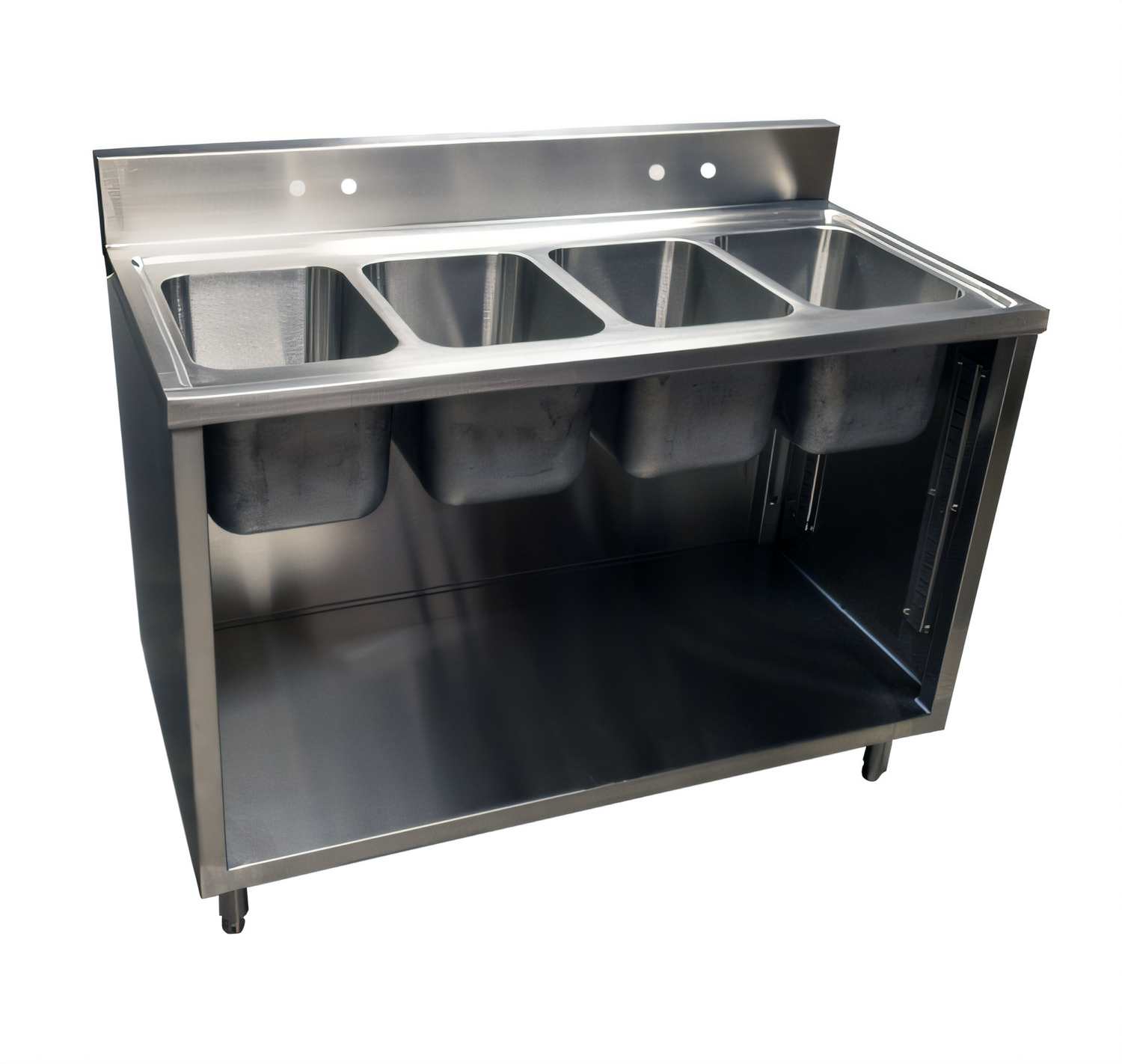 Model: 4-Compartment | NSF Certified | 18 ga / 304 SSBuilt for the daily rush of commercial kitchens, this BK Resources sink cabinet blends seamless deep-drawn bowls with a rugged marine-edge deck to keep water where it belongs—inside the sink. A roomy 48" width gives you four fully separated compartments for maximize productivity in prep, cleaning, or bar applications while the integrated cabinet base keeps plumbing protected and the workspace clutter-free.