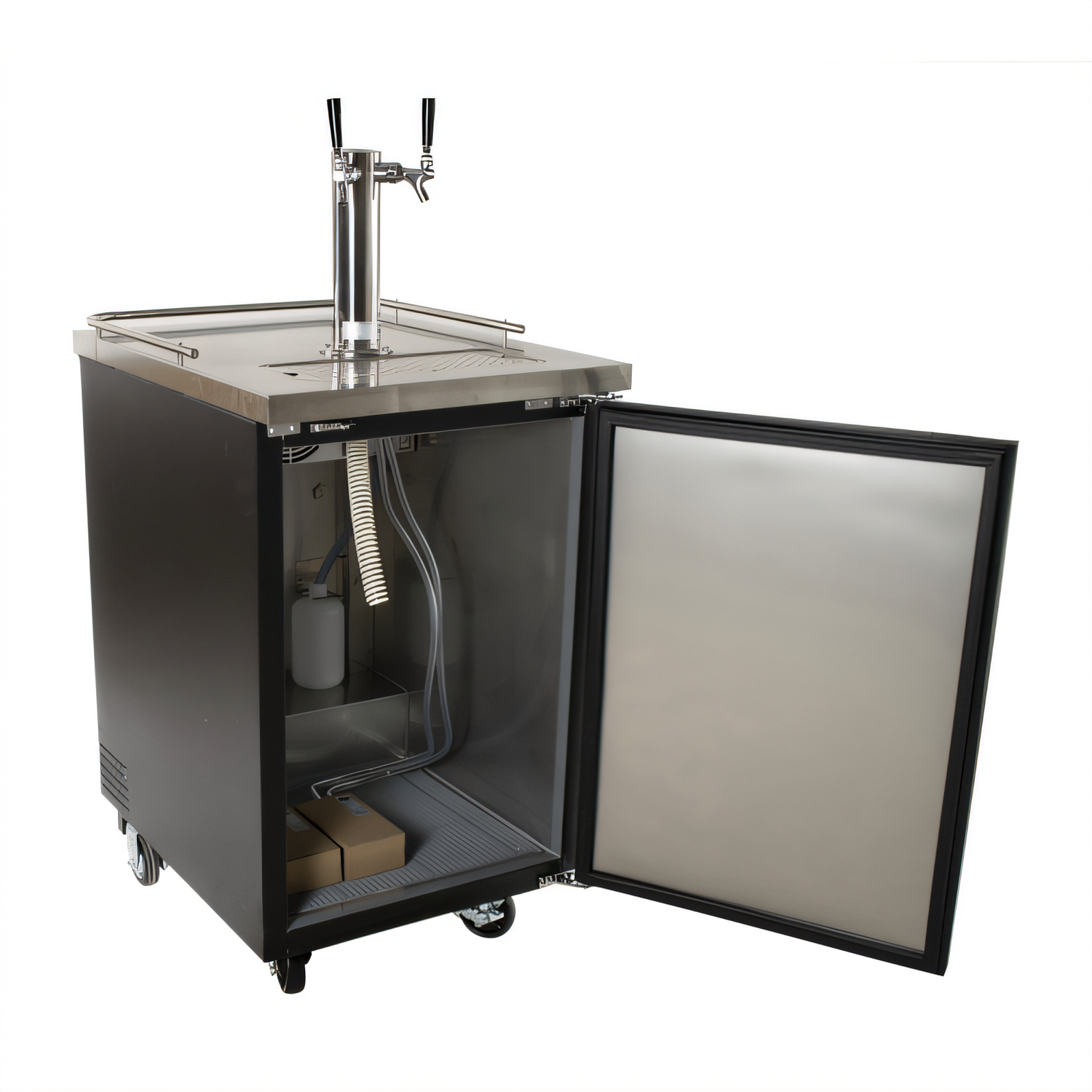 Single-keg dispenser with double-head tower & electronic controlsServe perfectly chilled pints from a space-saving footprint. The BK Resources DBC-11-24 kegerator pairs a rugged stainless-steel interior with an eco-friendly R290 refrigeration system to keep one full-size keg at an ideal 33–41 °F—ready for the next pour.