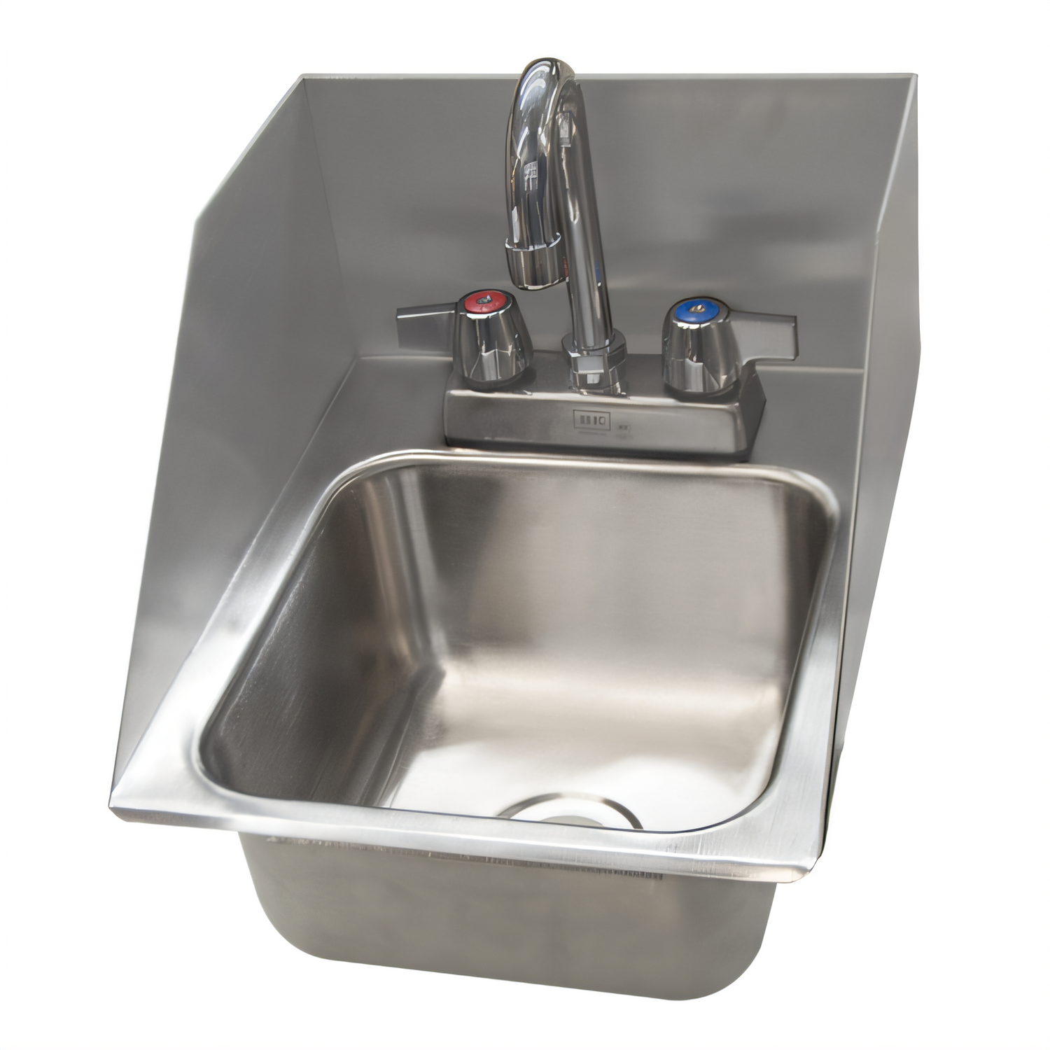 Deep Drawn Drop-In Sink, one compartment, 11-1/8"W x 13-1/2"D x 11"H overall size, (1) 9" wide x 9" front-to-back x 5" deep compartment, 4" OC deck mount faucet holes, 6"H splashes on sides & rear, includes 3" gooseneck faucet (BKD-3G-G) & basket drain with crumb cup (BKDR-2), 20/304 stainless steel construction, NSF