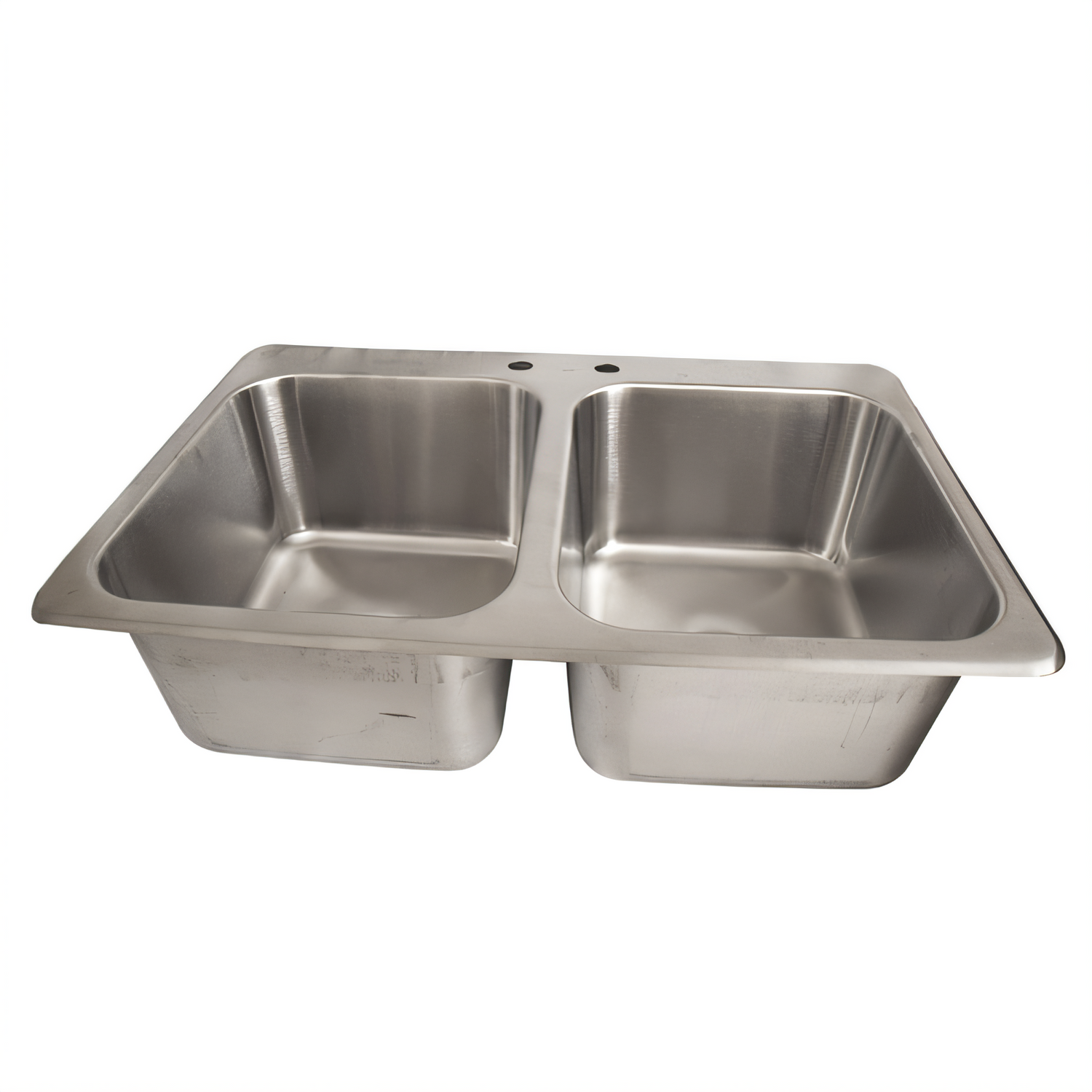 Drop-In Sink, two compartment, 31-1/4"W x 20-5/8"D x 10"H overall size, 14" wide x 16" front-to-back x 10" deep compartments, 4" OC deck mount faucet holes, includes (2) basket drains (BKDR-4), 18/304 stainless steel construction, NSF