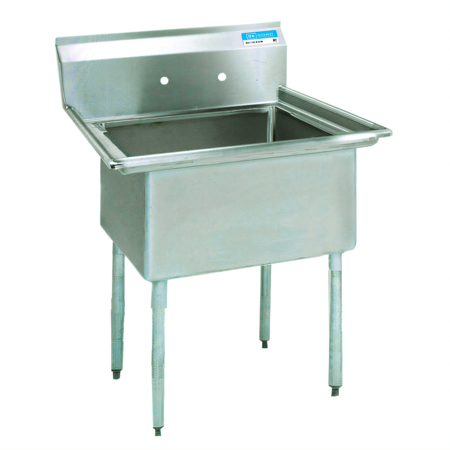 Economy Sink, one compartment, 23"W x 23-13/16"D x 43-3/4"H overall size, 18” wide x 18” front-to-back x 12” deep compartments, 9”H backsplash, 1-1/2” rounded front & side edges, 8” OC splash mount faucet holes, drain included, 18 gauge stainless steel deck & bowls, galvanized legs, adjustable high impact corrosion resistant feet, NSF (NET)