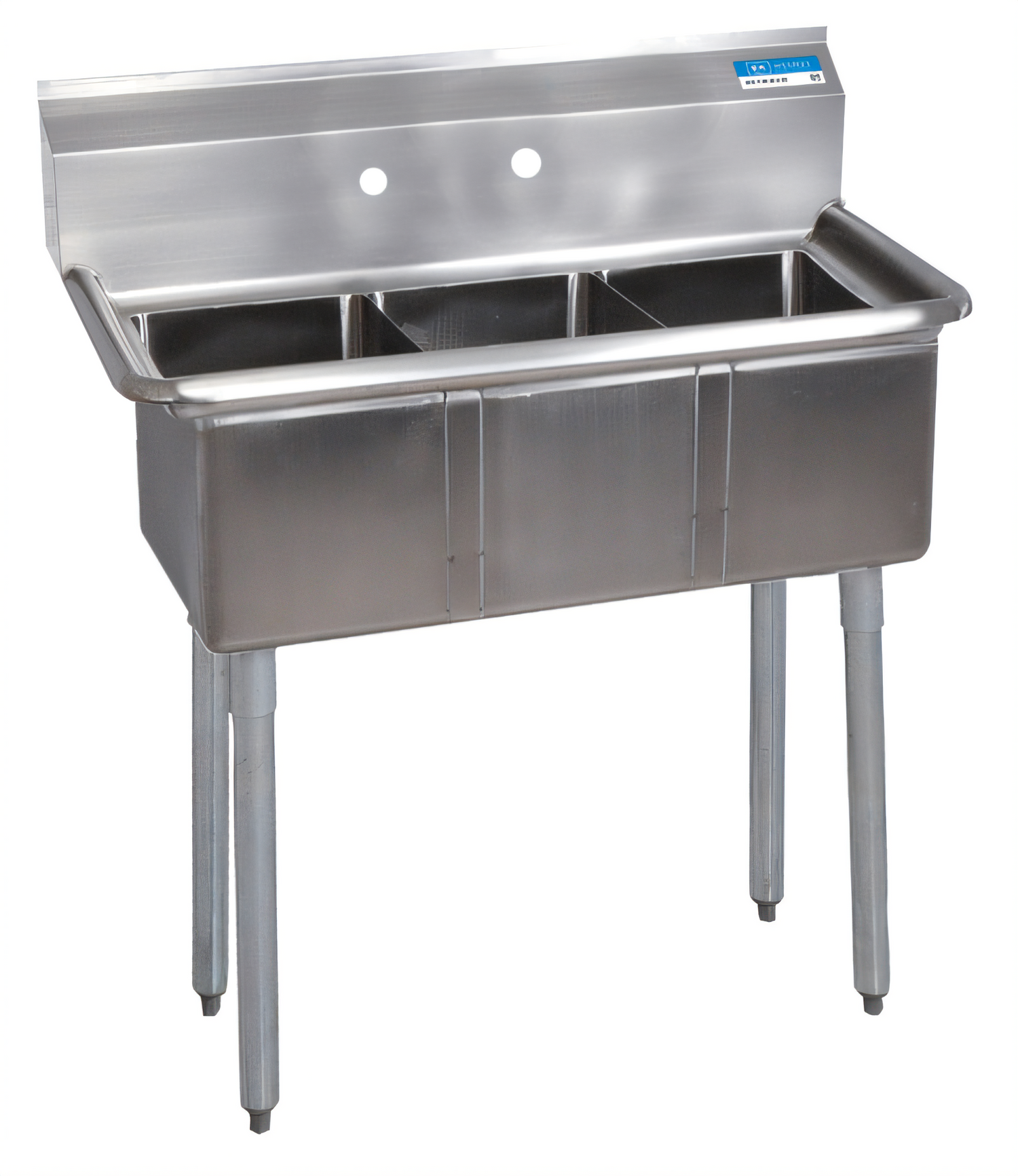 Economy Sink, three compartment, 35-1/2"W x 19-13/16"D x 43-3/4"H overall size, 10" wide x 14" front-to-back x 10" deep compartments, 9”H backsplash, 1-1/2” rounded front & side edges, 8” OC splash mount faucet holes, drains included, 18 gauge stainless steel deck & bowls, galvanized legs, adjustable high impact corrosion resistant feet, NSF (NET)