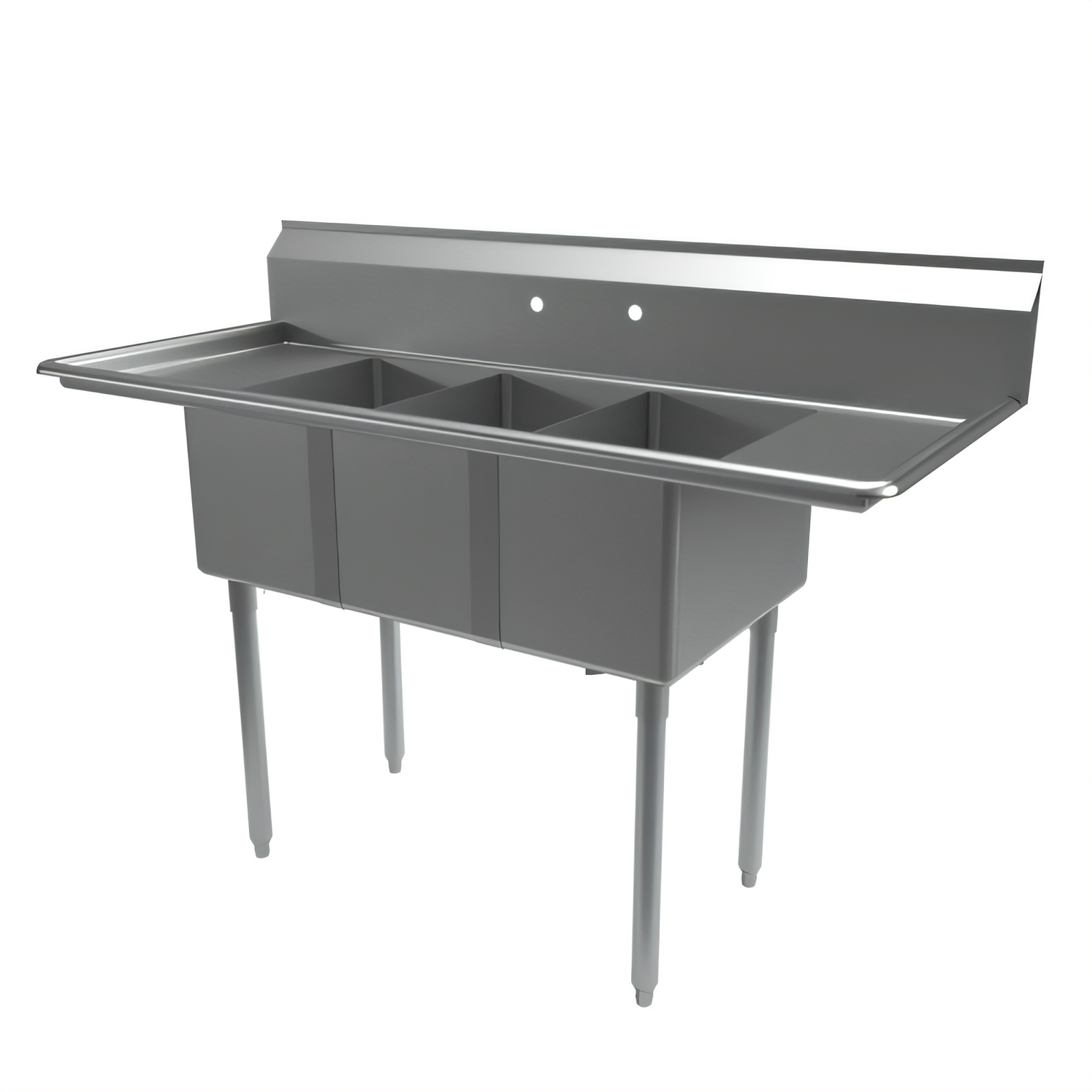 Economy Sink, three compartment, 60" x 25-13/16" overall size, 12" wide x 20" front-to-back x 12" deep compartments, 9"H backsplash, (2) 18" drainboards, 1/2" rounded front & side edges, 8" OC splash mount faucet holes, (3) (BKDR-4) 3-1/2" drains Included, 18 gauge stainless steel deck & bowls, galvanized legs, adjustable high impact corrosion resistant feet (NET)
