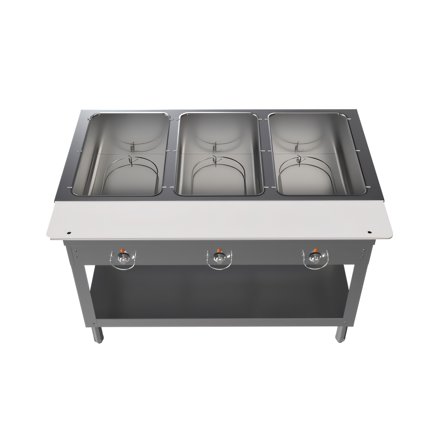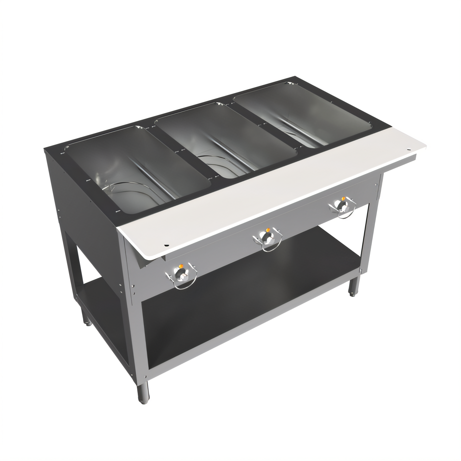 - 3-pan open-well design fits standard 12" × 20" full-size steam table pans (pans sold separately)