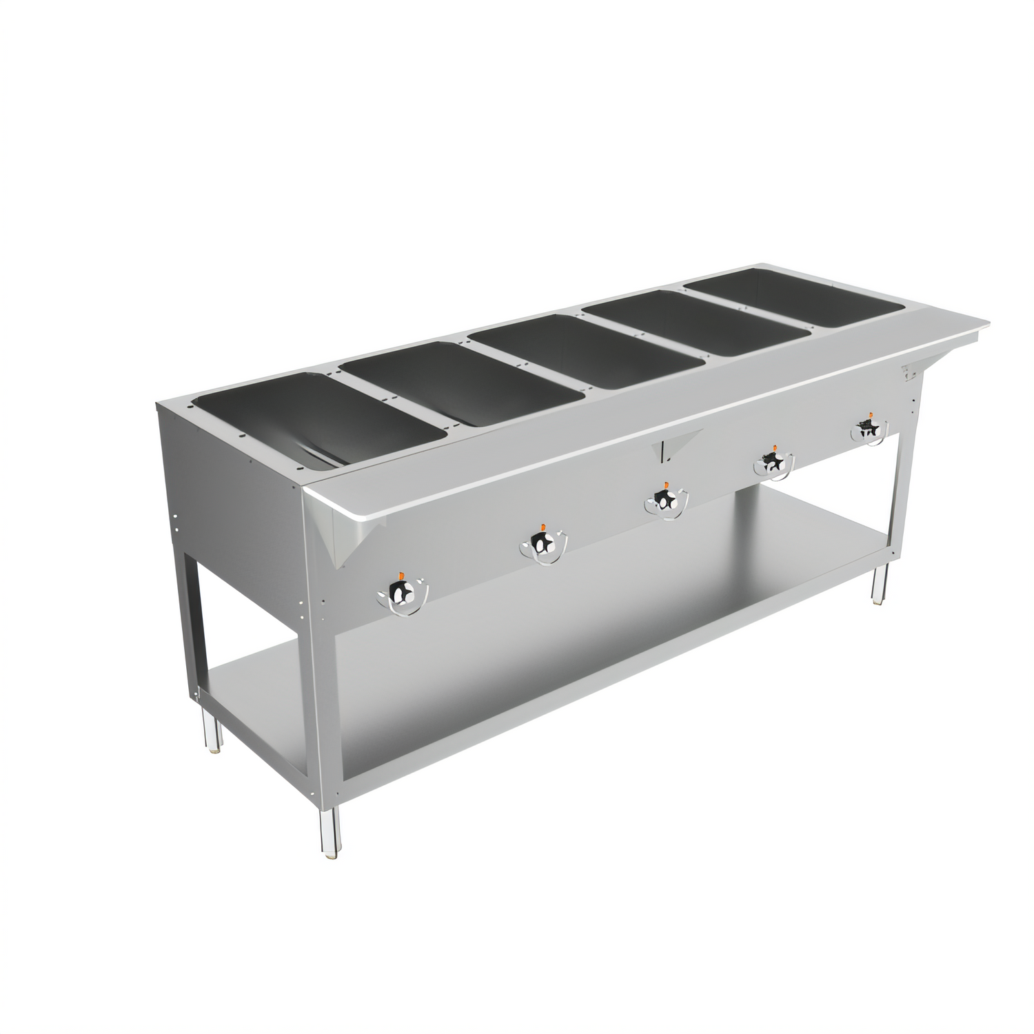 Open-Well Design • 20-Gauge Stainless Steel • 500 W Per WellKeep entrées, sides and sauces hot, fresh and ready for service with BK Resources’ durable 5-Pan Electric Steam Table. Built from rugged 20-gauge stainless steel and equipped with individually controlled, die-stamped wells, this unit delivers the consistent holding temperatures and workflow versatility busy kitchens demand.
