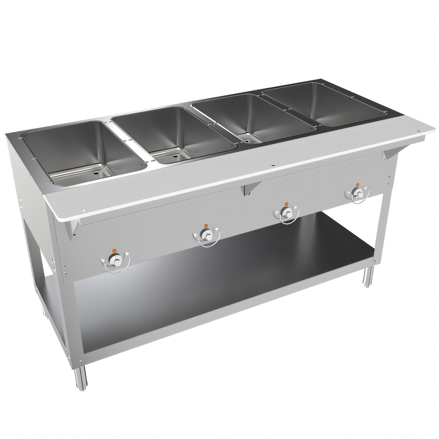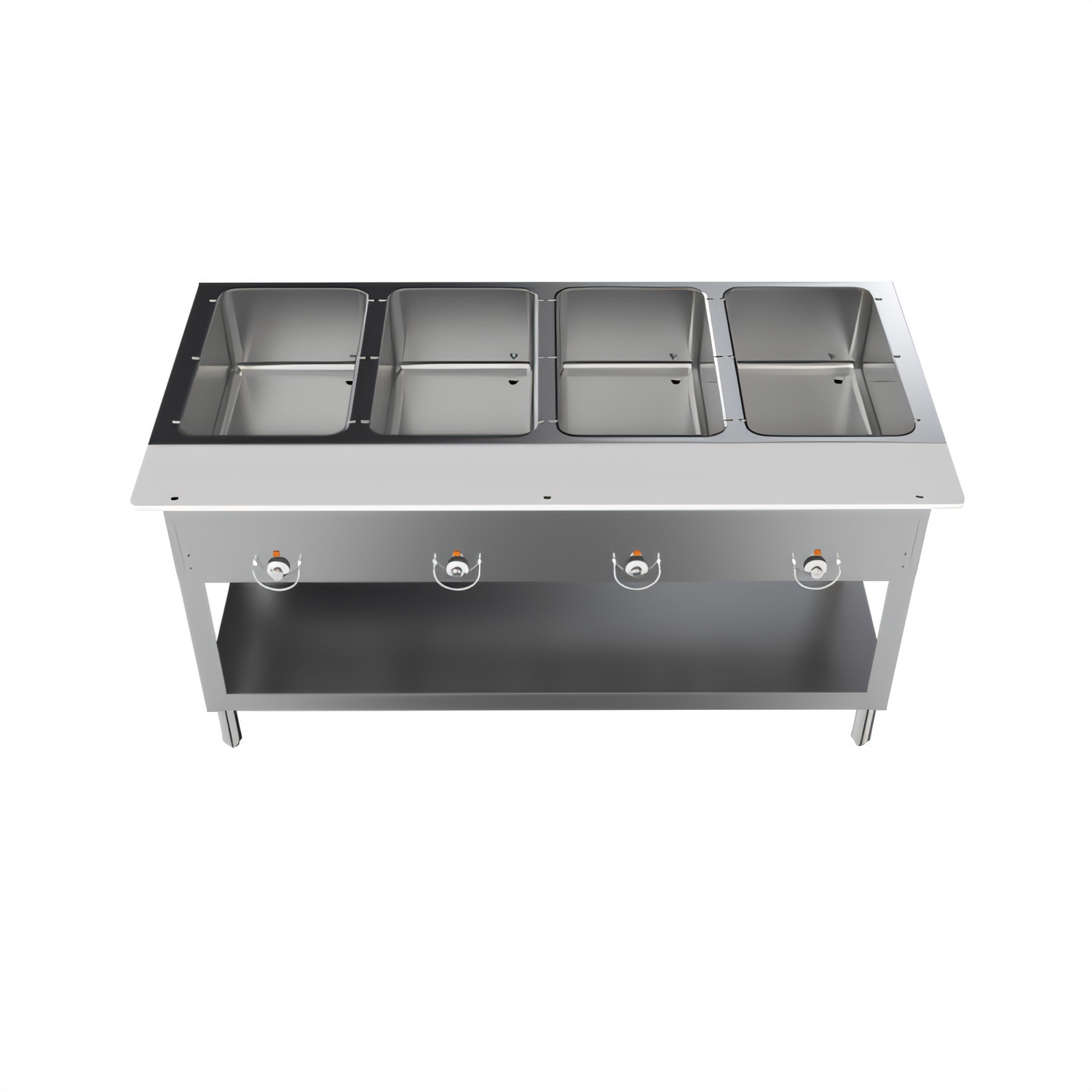 - Die-stamped openings accept four full-size steam table pans (sold separately).