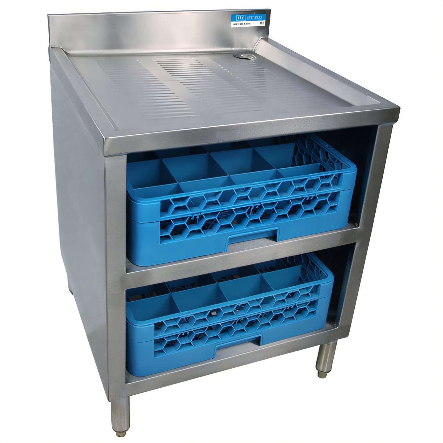 Underbar Glass Rack Unit, drainboard top, 24"W x 21"D x 32-1/2"H, open front base, adjustable shelf, 18/304 stainless steel top with 3" backsplash & 1" NPS drain (BKDR-15CP), stainless steel legs, adjustable high impact corrosion resistant feet, NSF