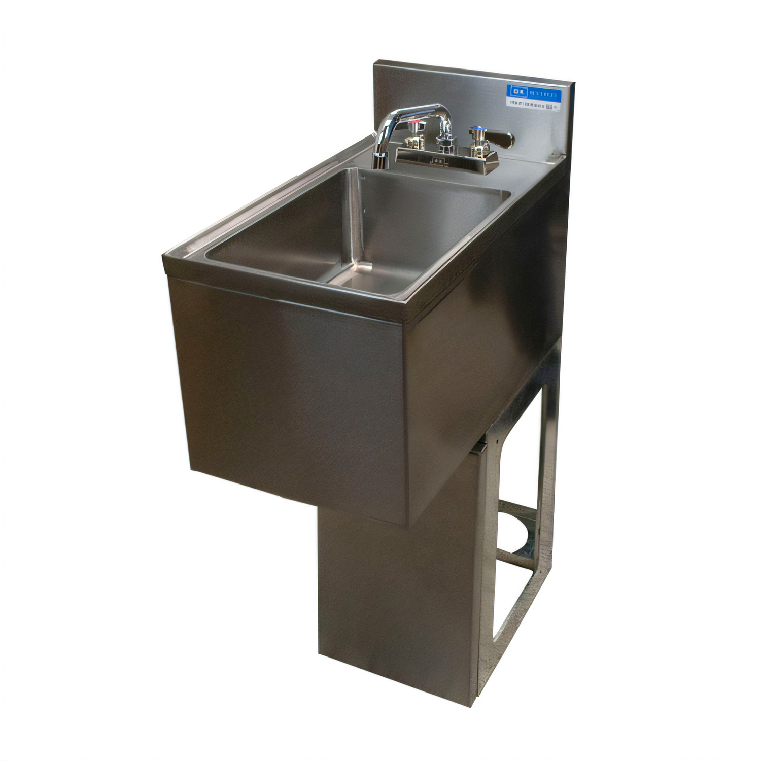Underbar Dump Sink, 14-1/2"W x 18-1/4"D x 33-1/2"H overall size, 10" wide x 14" front-to-back x 6" deep bowl, 4" OC splash mount faucet holes, 18/304 stainless steel top, pedestal base, NSF