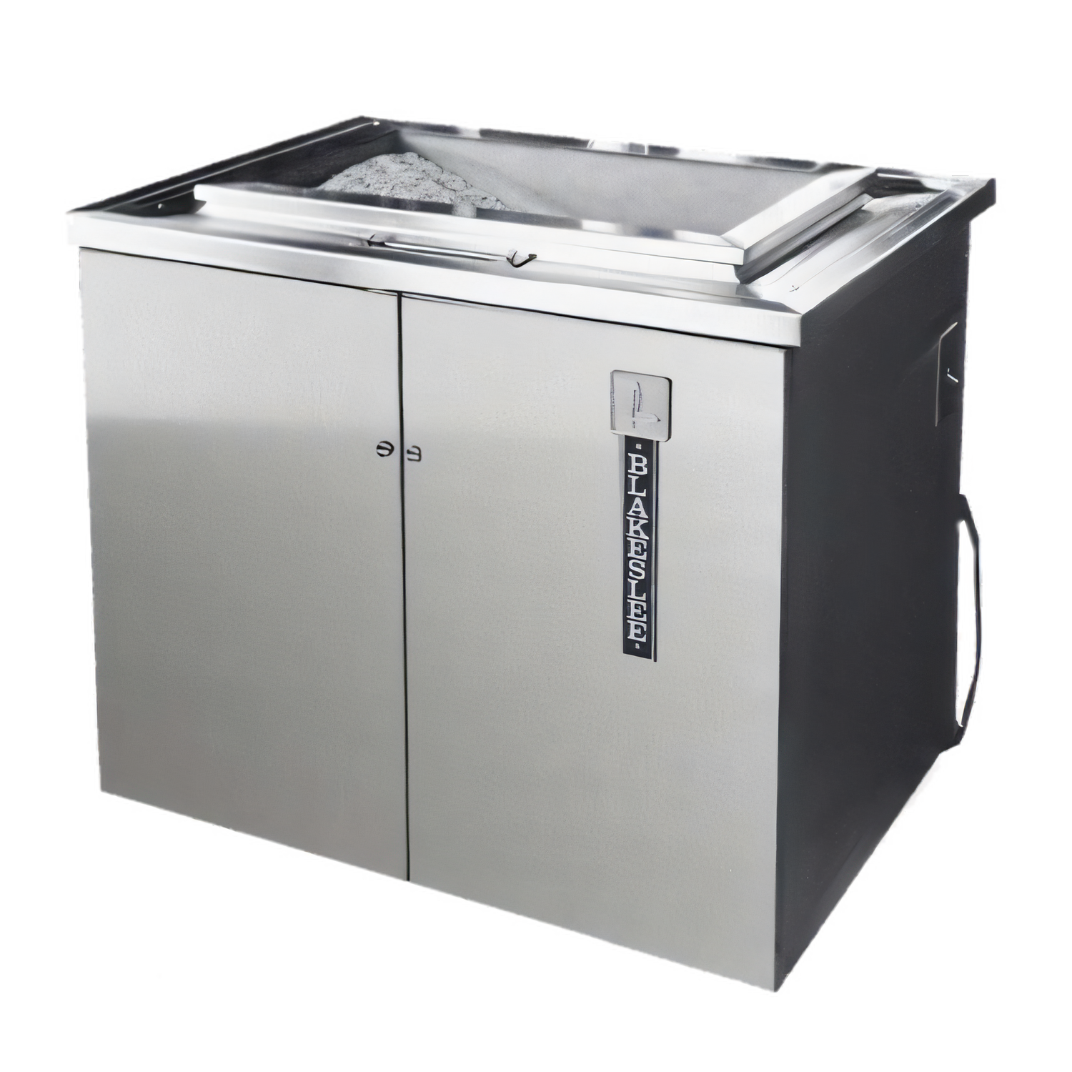 Burnisher System, silver saver, open-top design, stationary/enclosed, 160 lbs. porcelain ceramic media, (2) access & 1-pint bottles of liquid compound, stainless steel construction, 1-1/2 HP., 3450 R.P.M.