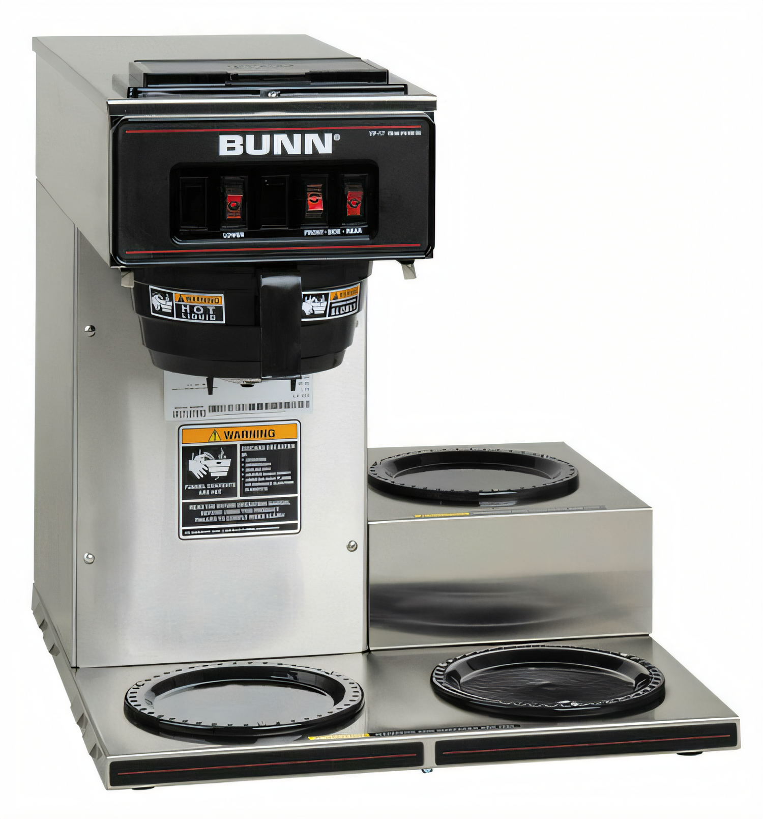 13300.0003 VP17-3 Coffee Maker, pourover type, brews 3.8 gallons per hour capacity, (3) lower warmer, plastic funnel, stainless decor, 120v/60/1-ph, 13.9 amp, 1670 watts, NEMA 5-15P, cord attached, UL, NSF