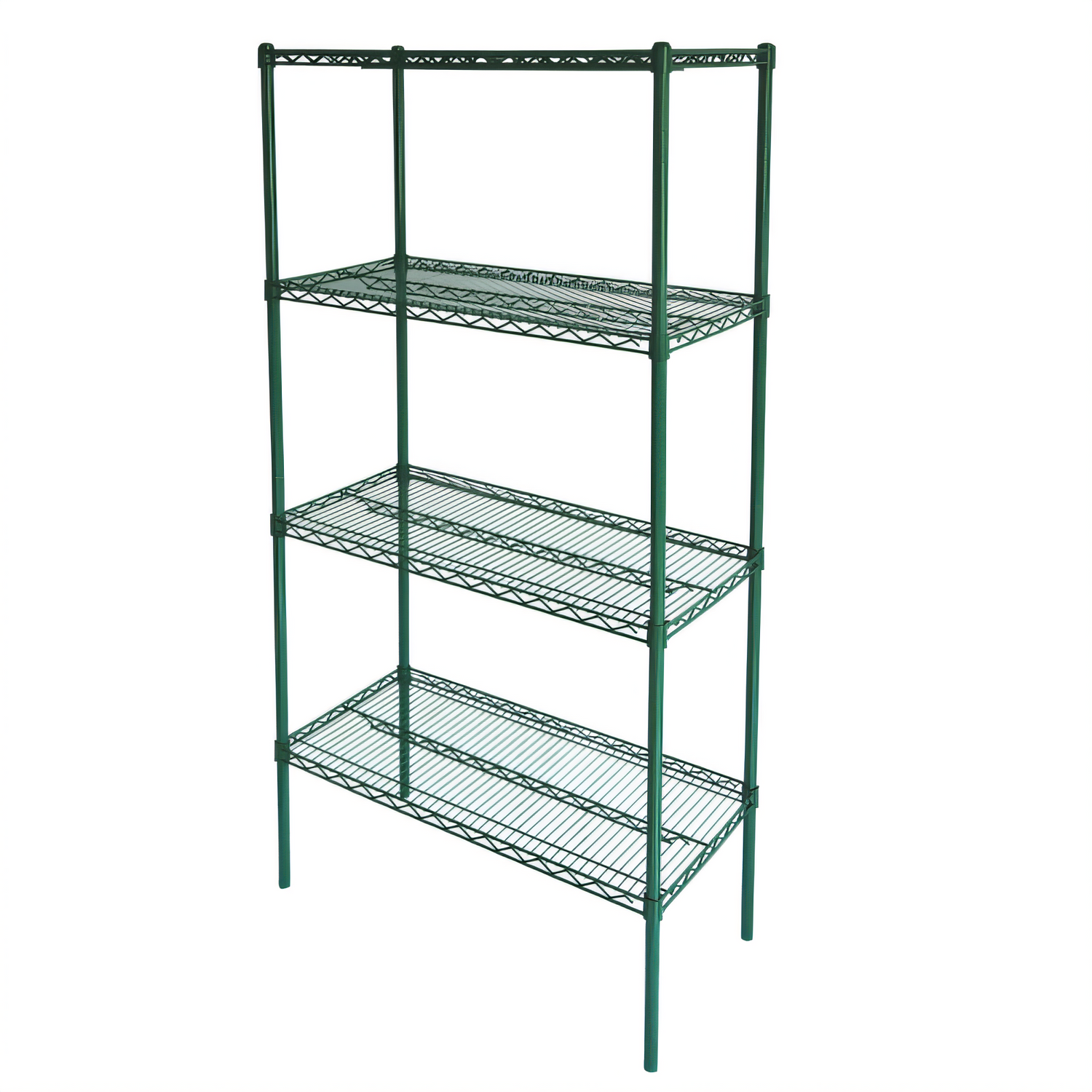 Wire Shelving Set, 36"L x 18"W x 72"H, heavy duty,includes (4) shelves, (4) posts, (16) clips, 850 lbs weight capacity, temperature reistant between -100°F to 500°F/-73°C to 260°C, epoxy coated metal, green, NSF (KD) (Sold by case)