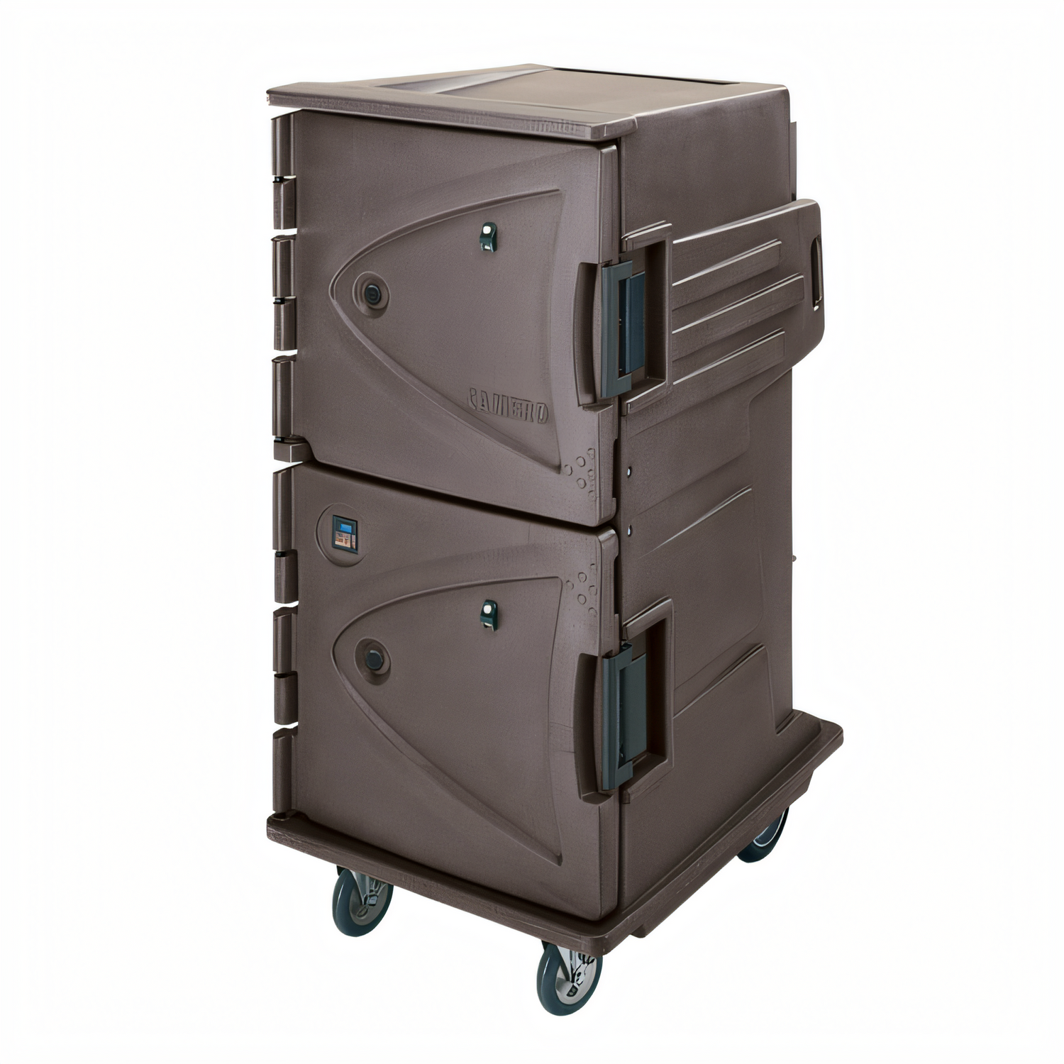 Cambro Camtherm heated cart: tall electric double-door cabinet holds multiple pan sizes, adjustable temp, durable polyethylene, NSF/ENERGY STAR.
