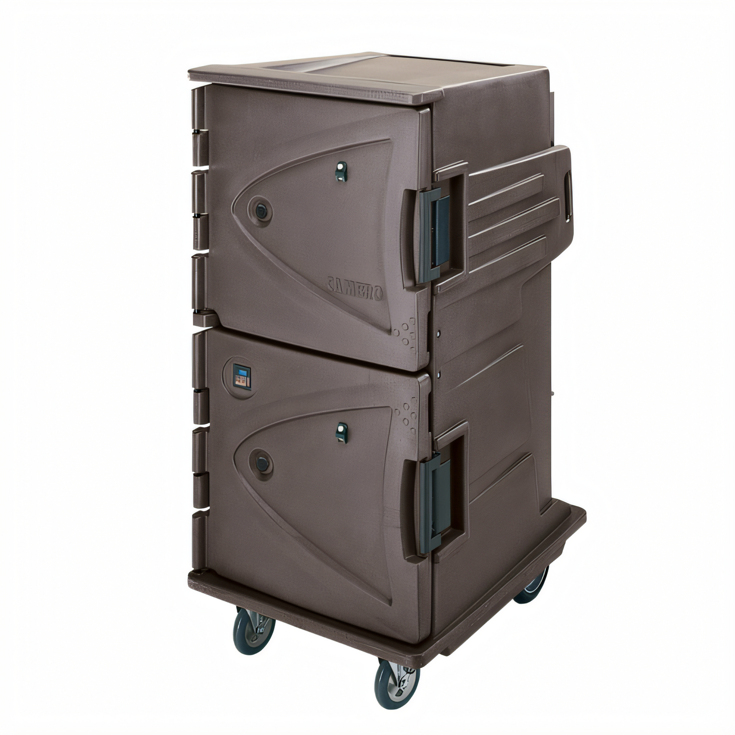 Camtherm® Hot/Cold Cart, 30-1/2"W x 39"D x 64-3/8"H, electric, tall profile, double door, (12) 18" x 26" sheet pans (requires five additional rail sets), (24) 12" x 20" x 2-1/2" deep food pans, (16) 12" x 20" 4" deep food pans, (12) 12" x 20" x 6" deep food pans, (8) 12" x 20" x 8" deep food pans, temperature control dial, on-off power switch, adjustable chrome plated slide rails, Celsius solar digital thermometer, molded-in handles & bumpers, serving top, menu clip, (2) 6" front swivel casters with brakes & (2) 6" rear casters, 9' cord with plug, polyethylene exterior, granite sand, 110v/50/60/1-ph, 1570 watts, 14.3 amps, NEMA 5-15P, NSF, ENERGY STAR®, CETLus, Made in USA