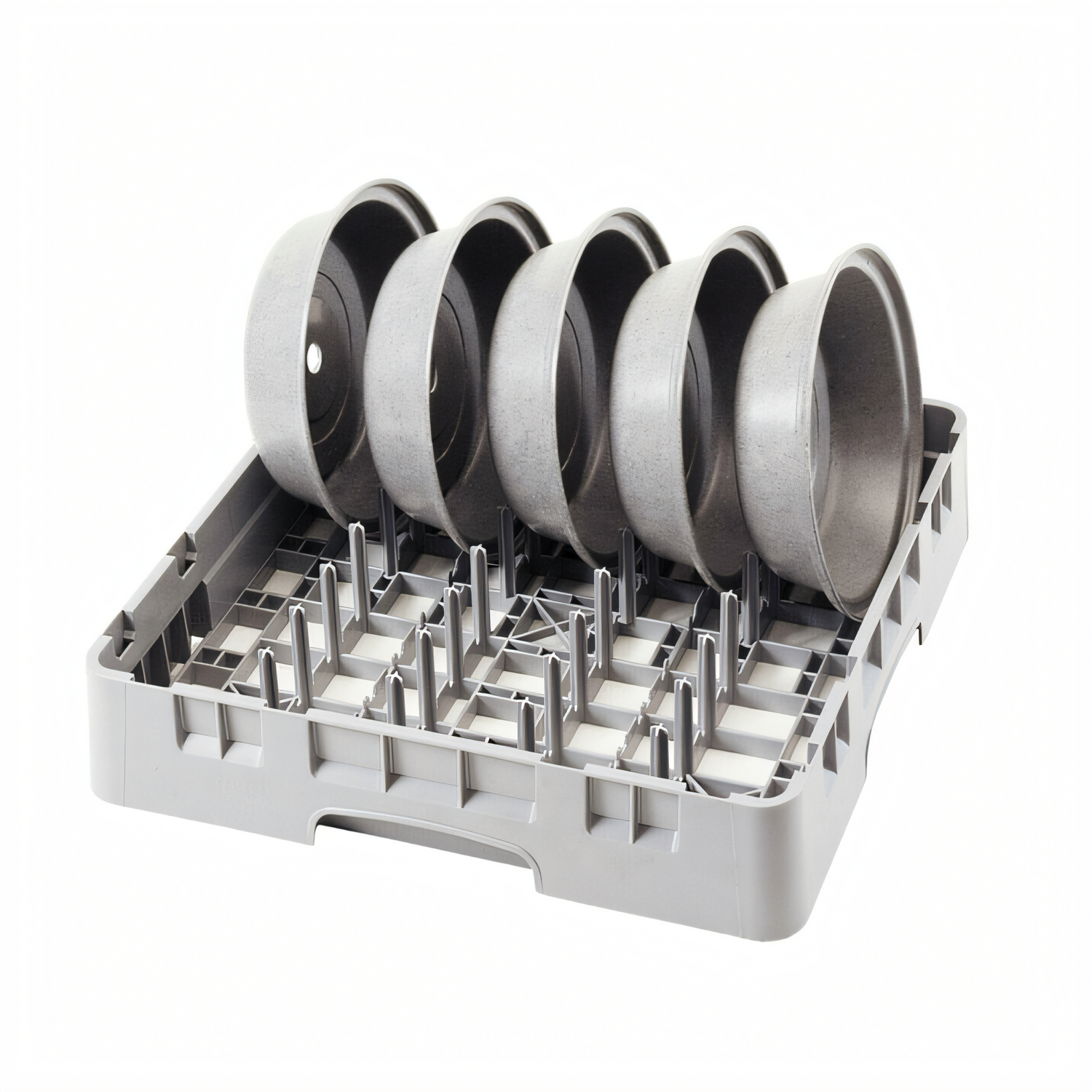 Camrack® 5 x 9 Peg Rack, full size, with (1) extender, 5 spacing & 9 spacing configurations, will hold 10" deep dish plates or pasta & soup bowls, smooth sides, round corners, ergonomic handles, 4-7/8" max. height, soft gray, NSF, Made in USA