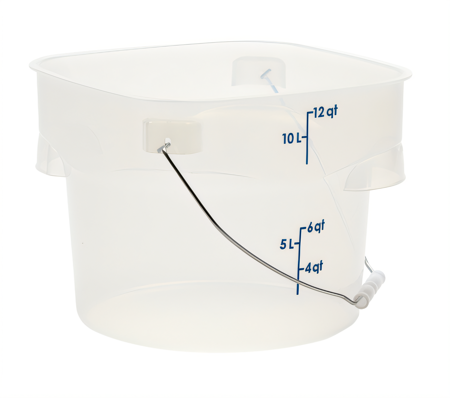 Cambro CamRound® 12 qt FreshPro pail – translucent, stain-resistant polypropylene, dishwasher-safe, NSF certified, made in USA.